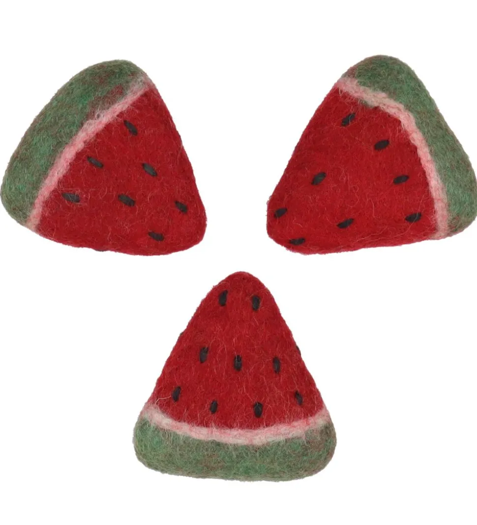 Sjovt Papoose legemad, der forestiller 3 skiver vandmelon i rød og grøn filtet uld.