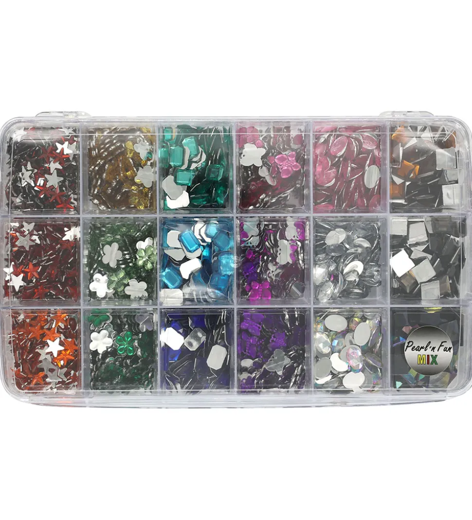 Fine Pearl N Fun perler med selvklæbende rhinsten i mange farver og med forskellige former i et sæt til at lave flotte dekorationer.