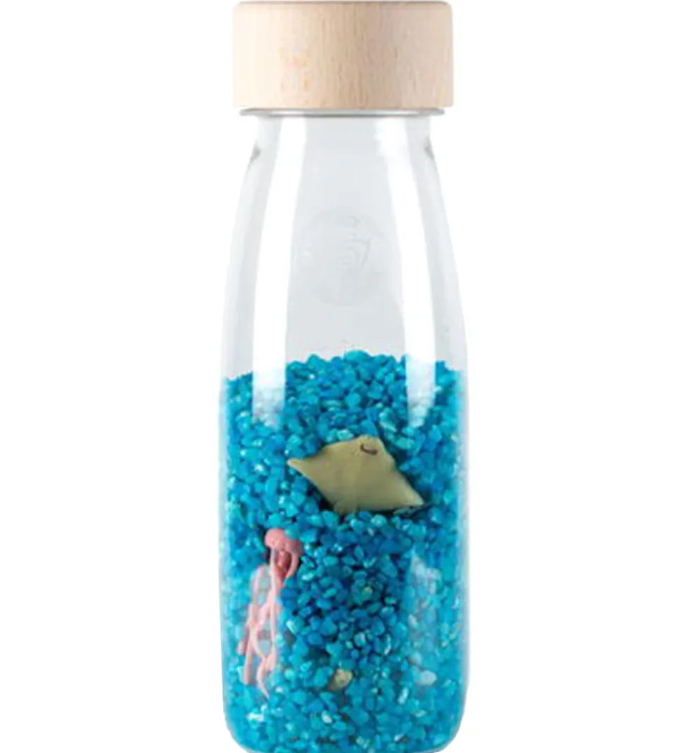 Fint Petit Boum sanselegetøj, der er formet som en flaske med et helt glat trælåg, og inden i flasken ses indholdet, som består af blåt konfetti, hvori der gemmer sig masse forskellige havdyr, som barnet kan udspionere i deres “naturlige” habitat.