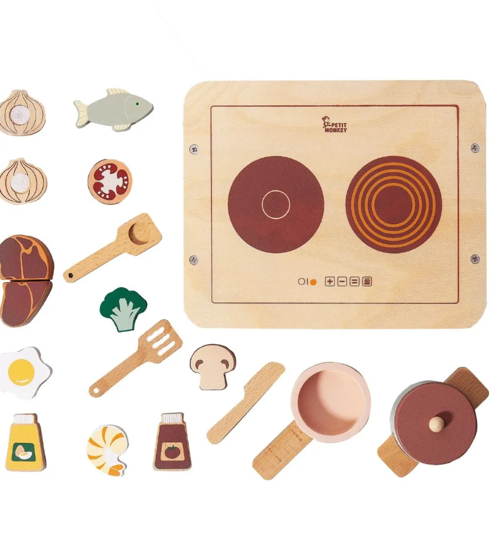 Sættet indeholder en serveringsbakke, og når den bliver vendt om, er der 2 kogeplader, så den kan bruges som et komfur. Der medfølger også en gryde og en pande, forskelligt legemad og nogle køkkenredskaber.