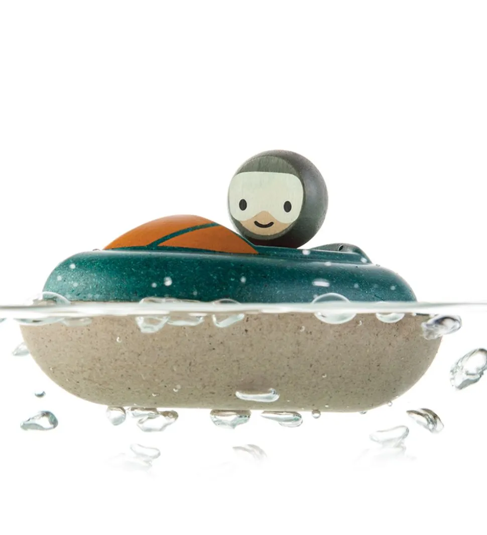 Sejt PlanToys badelegetøj med en grøn speedbåd og en dreng til at styre båden.