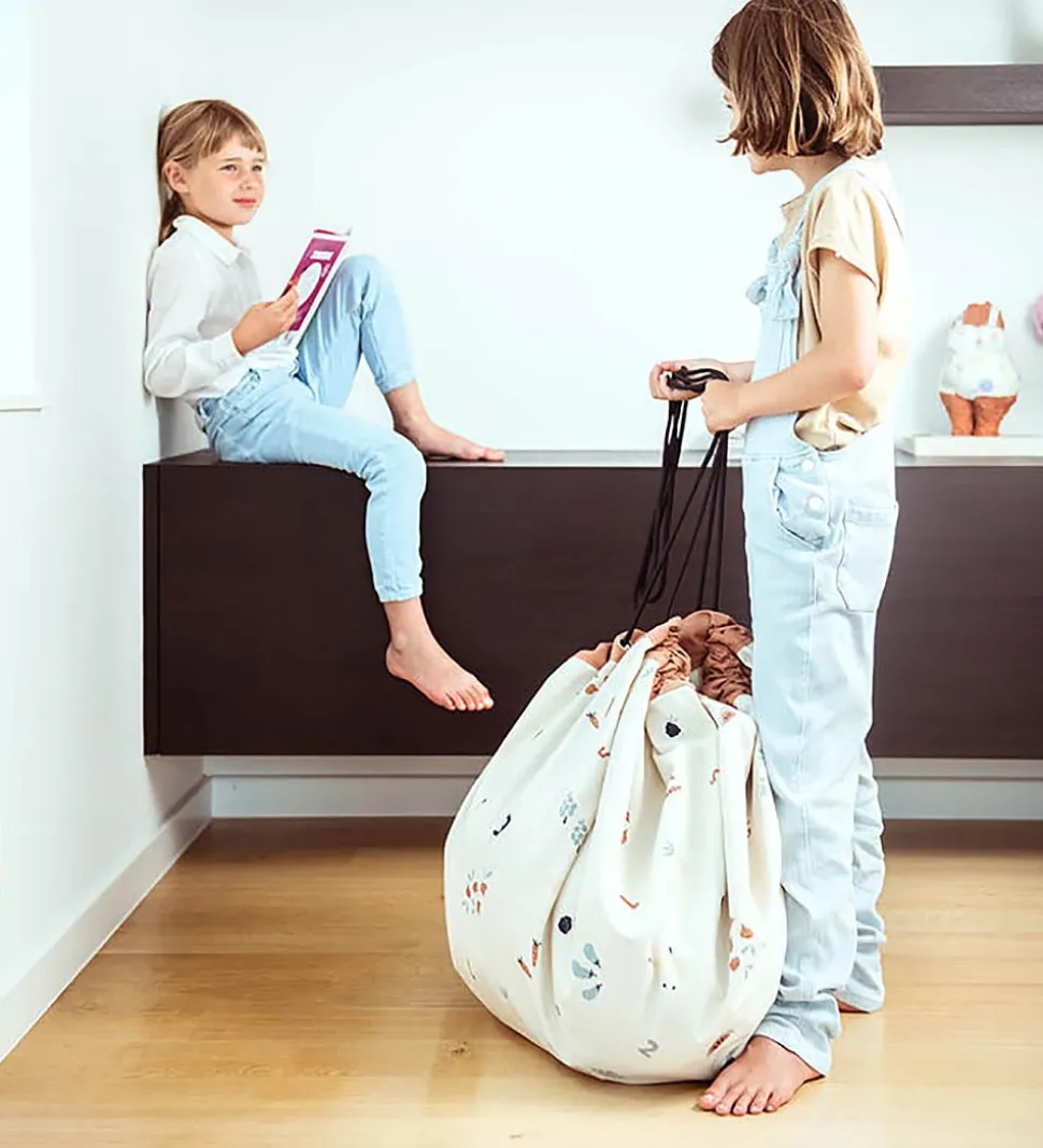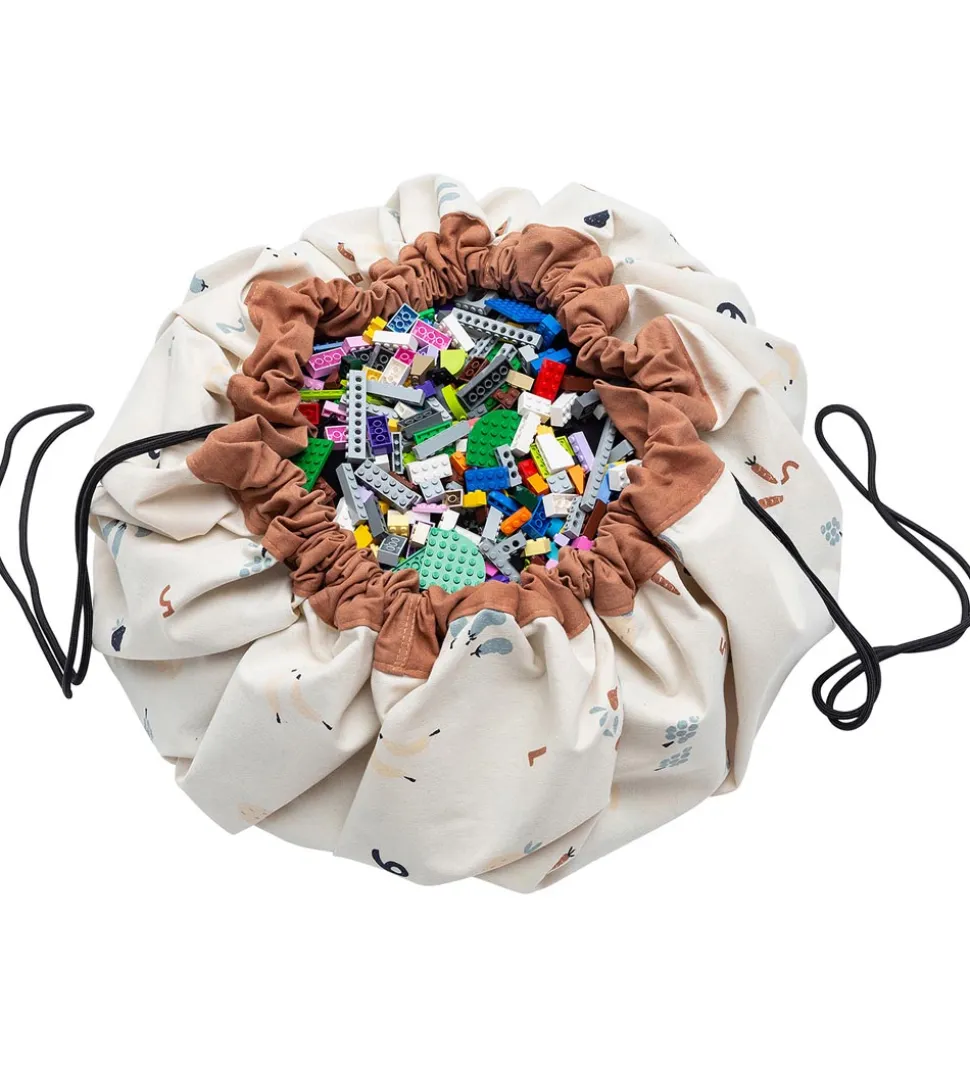 Play&Go legetøjstæppet er et stort cirkelformet stykke stof med en løbegang hele vejen rundt med en sort snor, så man kan snøre tæppet sammen til en pose. I posen kan man opbevare sit legetøj, og når børnene synes, at legetøjet skal med ind i stuen, kan posen åbnes og legetæppet folder sig ud. Bagefter er det hurtigt og nemt at rydde op og lægge på plads.