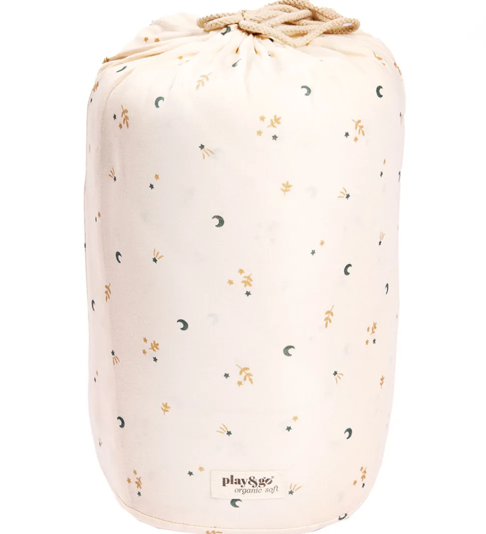 Flot Play&Go legetøjstæppe i cremehvid med et alloverprint af små, fine måner, stjerne og grene i blågrøn og lysebrun.