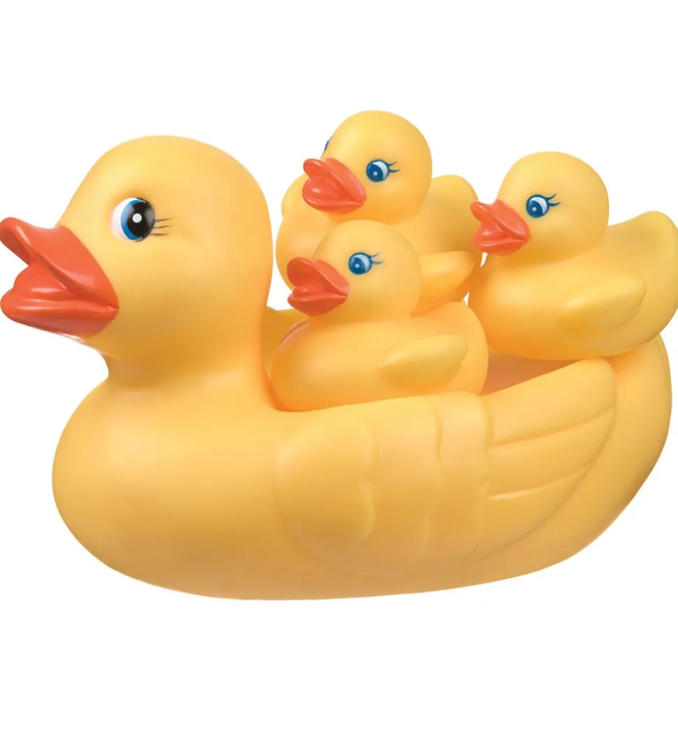 Sjovt Playgro badelegetøj bestående af en stor and med tre ællinger.