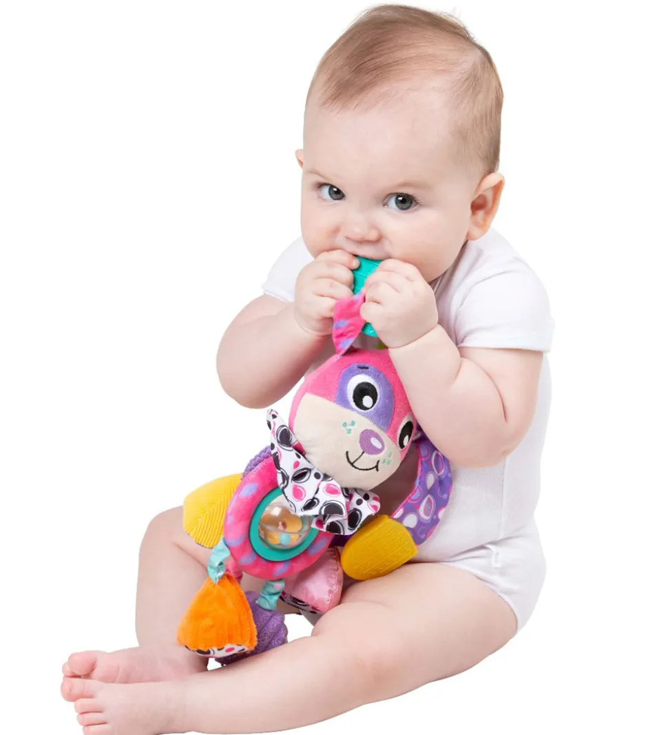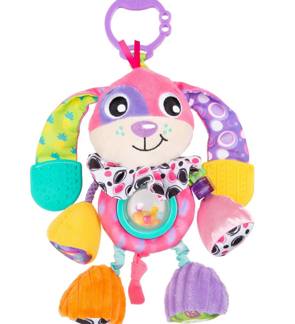 Skønt Playgro barnevognsophæng formet som en kanin i et væld af farver med forskellige mønstre. Barnevognophænget har lange ører med knitrelyde og en plade i enderne, som barnet kan bide i. Barnevognsophænget har forskellige strukturer og en rangle i midten. Barnevognsophænget kan underholde på farten eller leges med derhjemme.