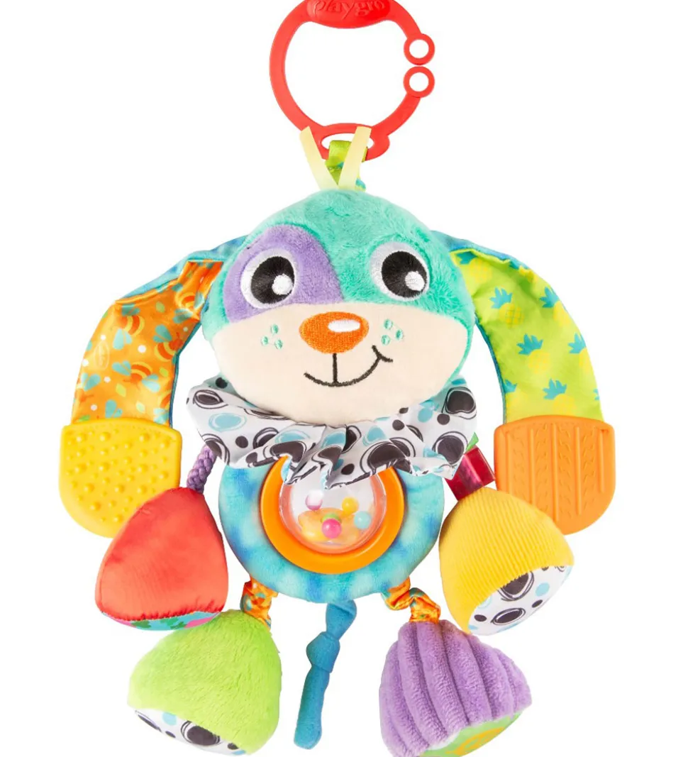 Sødt Playgro barnevognsophæng formet som en kanin i mange farver med forskellige mønstre. Barnevognophænget har lange ører med knitrelyde og en plade i enderne, som barnet kan bide i. Barnevognsophænget har forskellige strukturer og en rangle i midten. Barnevognsophænget kan underholde på farten eller leges med derhjemme.