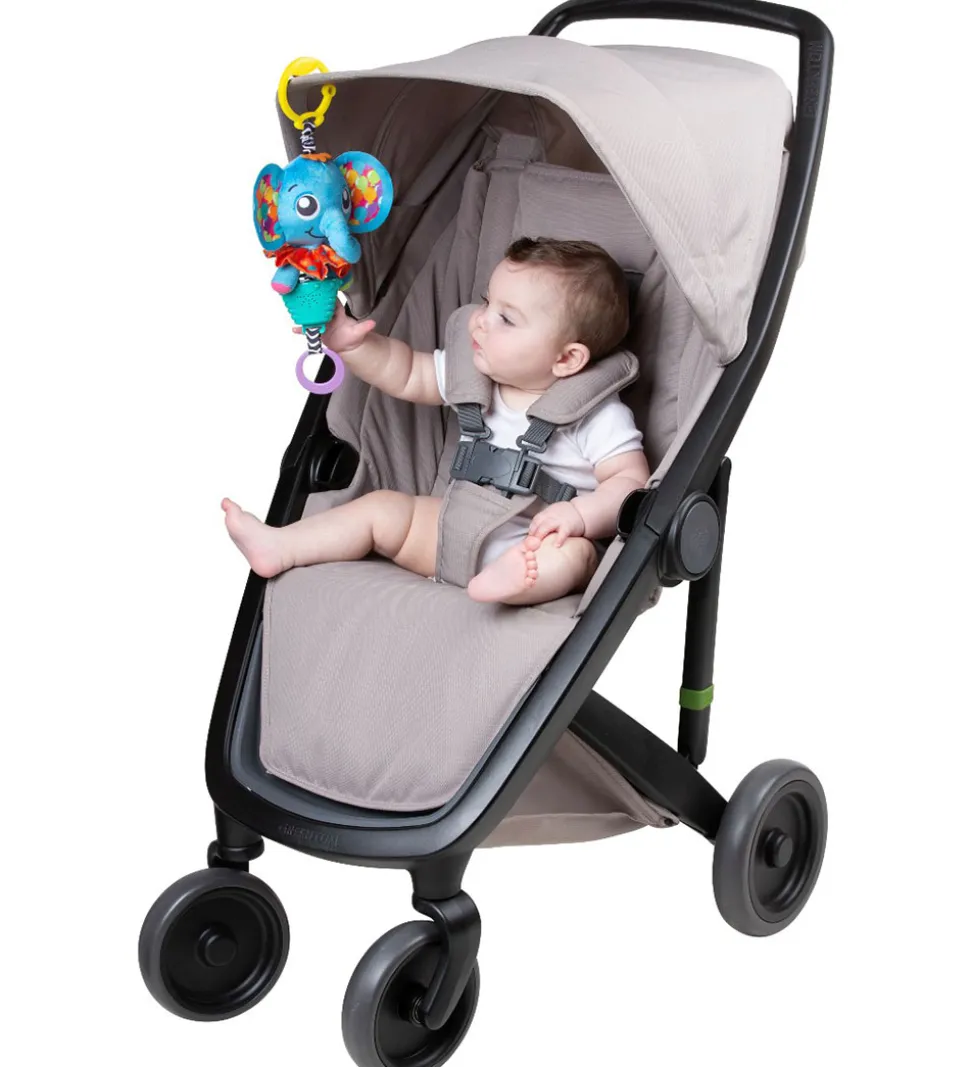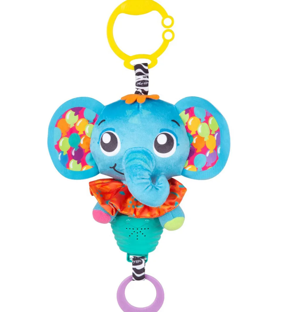Fint Playgro barnevognsophæng formet som en farverig elefant. Den har forskellige strukturer og i bunden er der en ring, som man kan trække i, hvorefter barnevognsophænget spiller en melodi. Barnevognsophænget kan underholde på farten eller leges med derhjemme.
