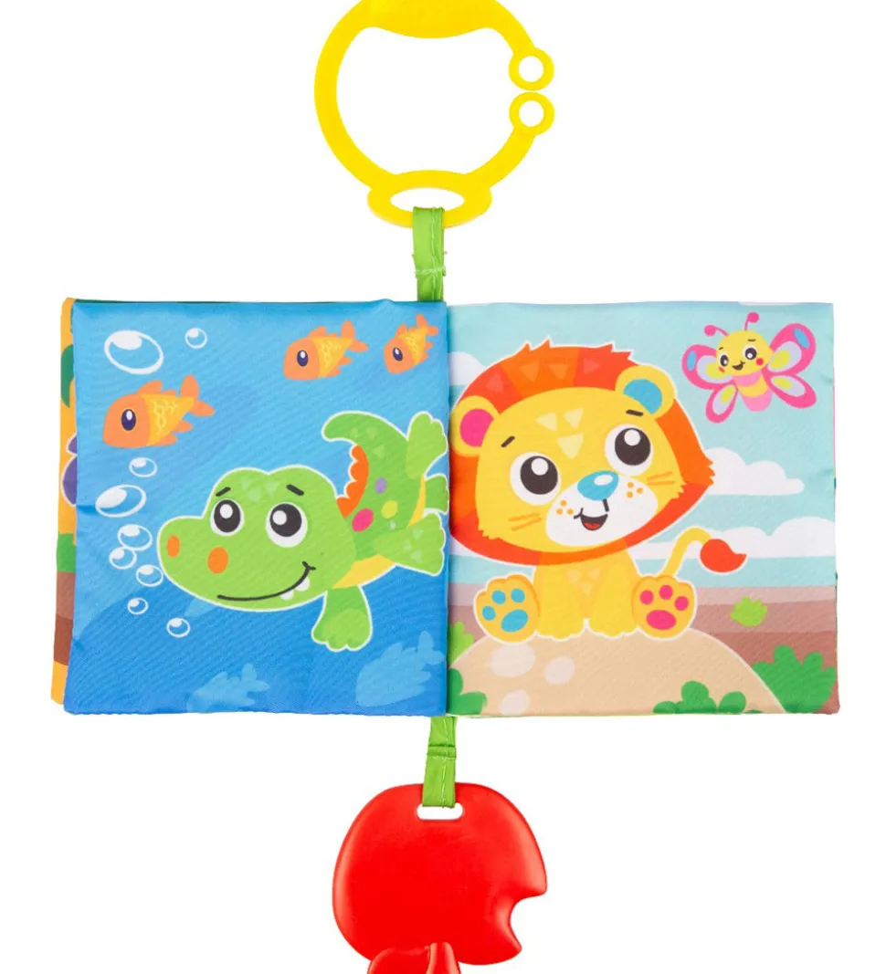 Fin Playgro stofbog med illustrationer i et væld af farver, som fanger opmærksomheden. Playgro stofbogen har et rødt æble, som barnet kan bide i. I den ene side er der en gul ring, som stofbogen kan hænges op i.