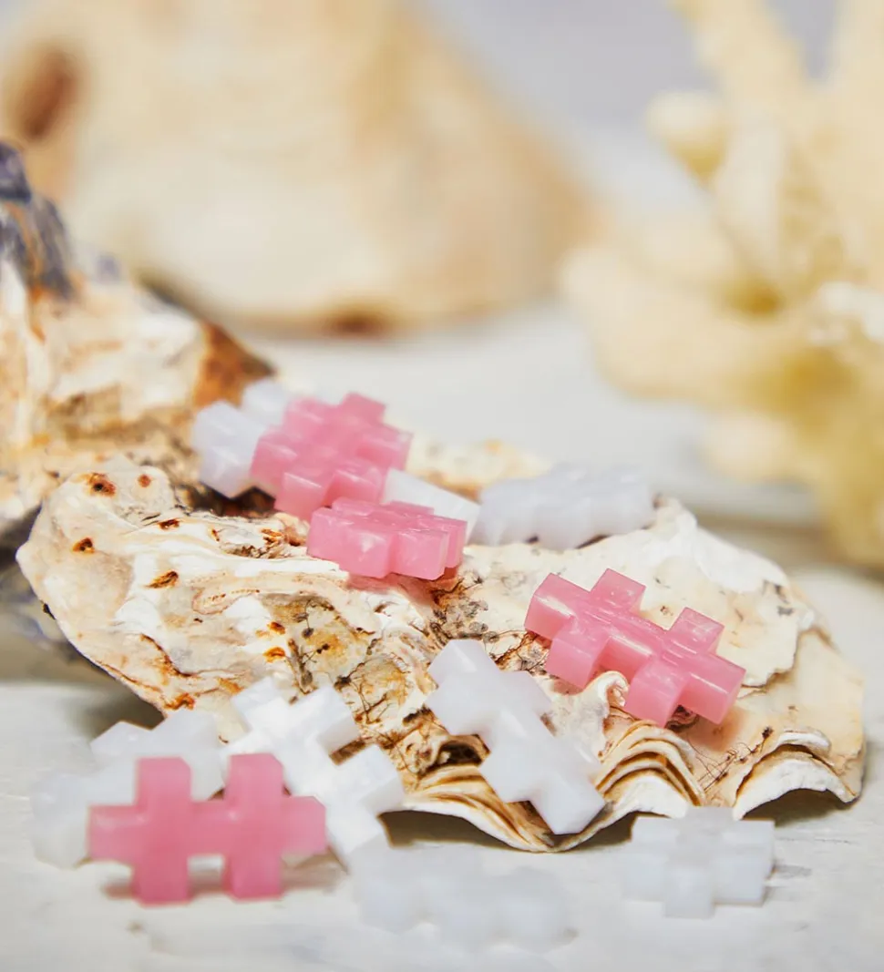 Plus-Plus klodserne har form som plus-tegn, hvilket gør at de kan sættes sammen på alle leder og kanter.