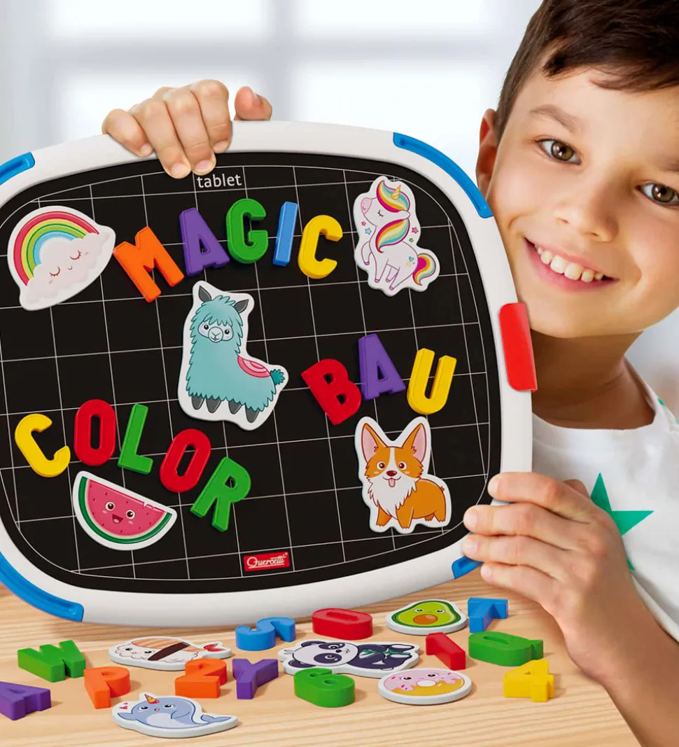 Sjov Quercetti magnetisk tavle i flotte farver med magnetiske bogstaver og søde figurer. Den magnetiske tavle er dobbeltsidet, og på den anden side er der et whiteboard, hvor der kan tegnes. I æsken medfølger: