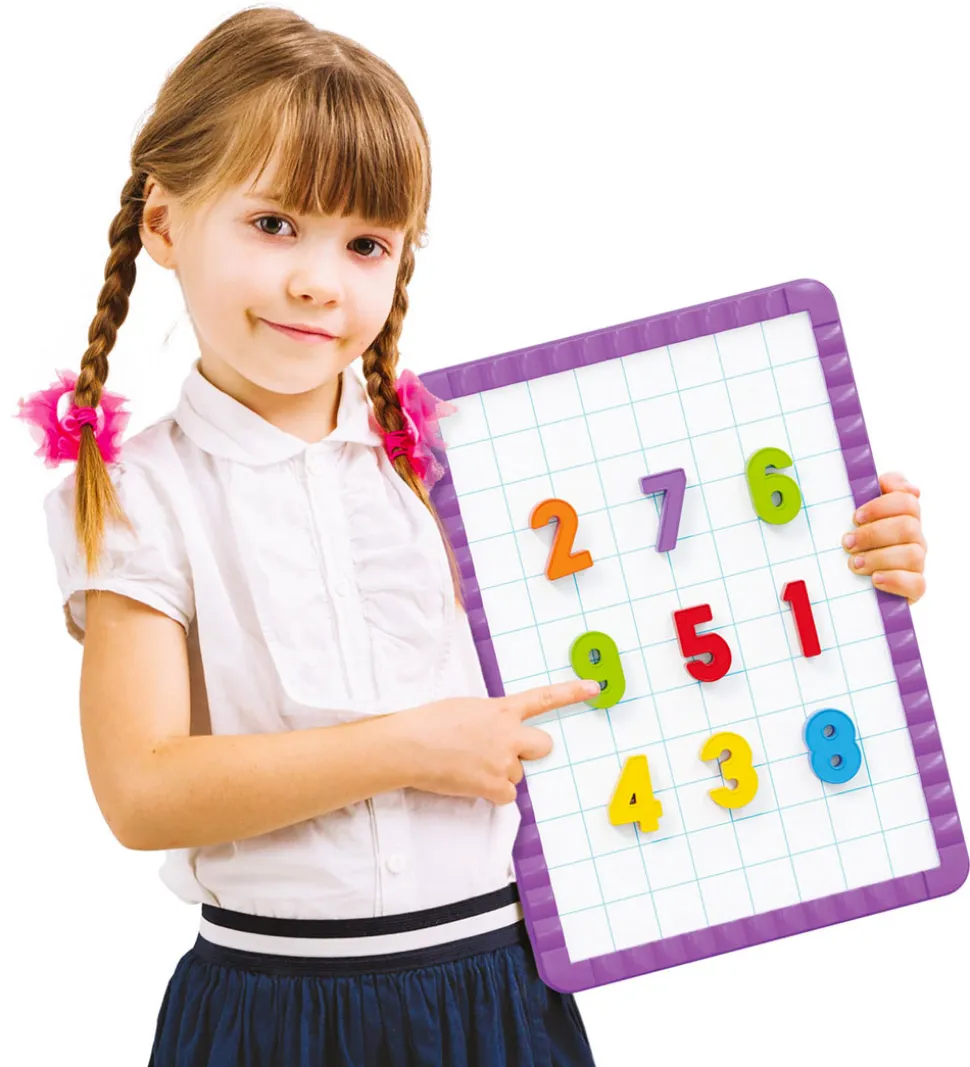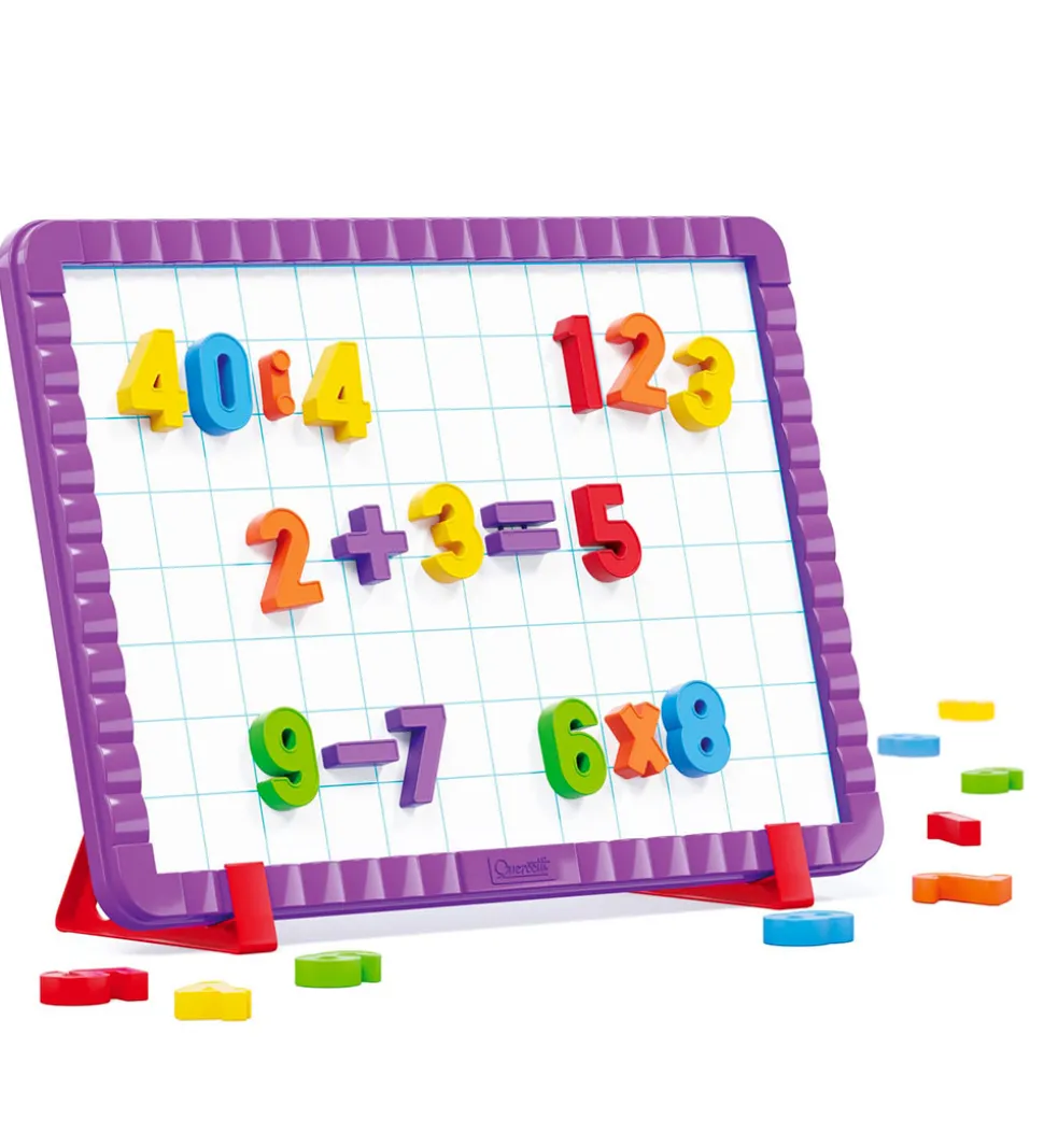 Sjov Quercetti magnetisk tavle i lilla med magnetiske tal og matematiske symboler. I æsken medfølger: