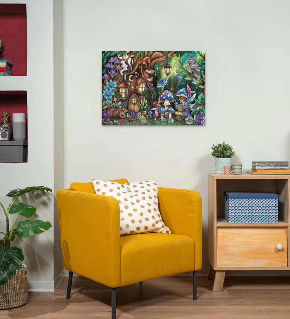 Fortryllende Ravensburger puslespil med motiv af en skov med bl.a. et træhus, dyr og svampe.