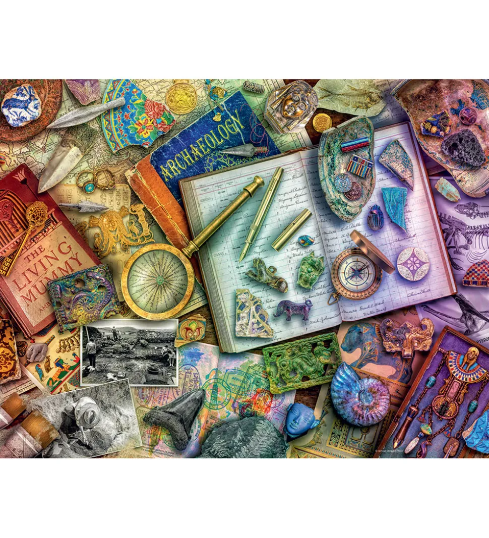 Flot Ravensburger puslespil med et motiv inspireret af en arkæologs skrivebord.