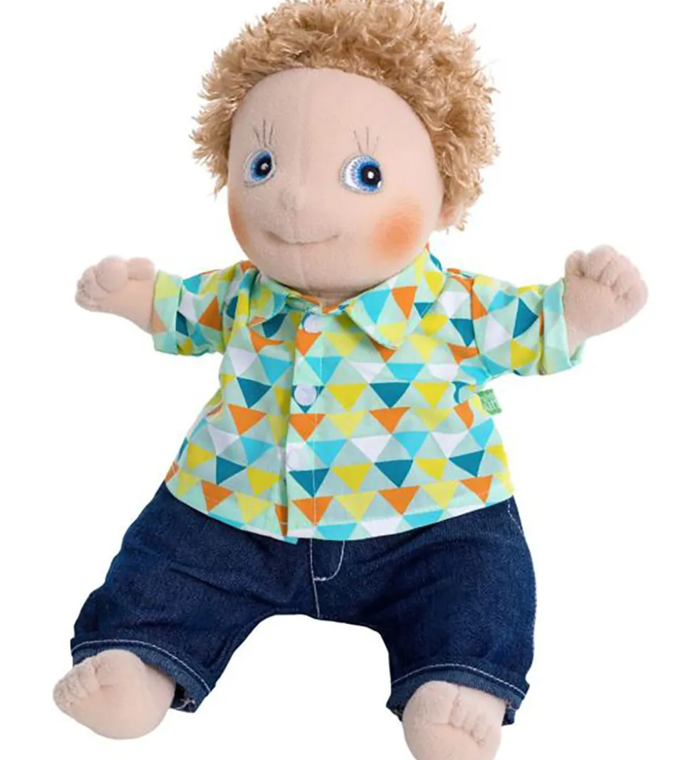 Charmerende Rubens barn dukke iført en skjorte med korte ærmer i et farverigt mønster af trekanter. Bukserne er i mørk denim, der fuldender dukkens stilfulde look.