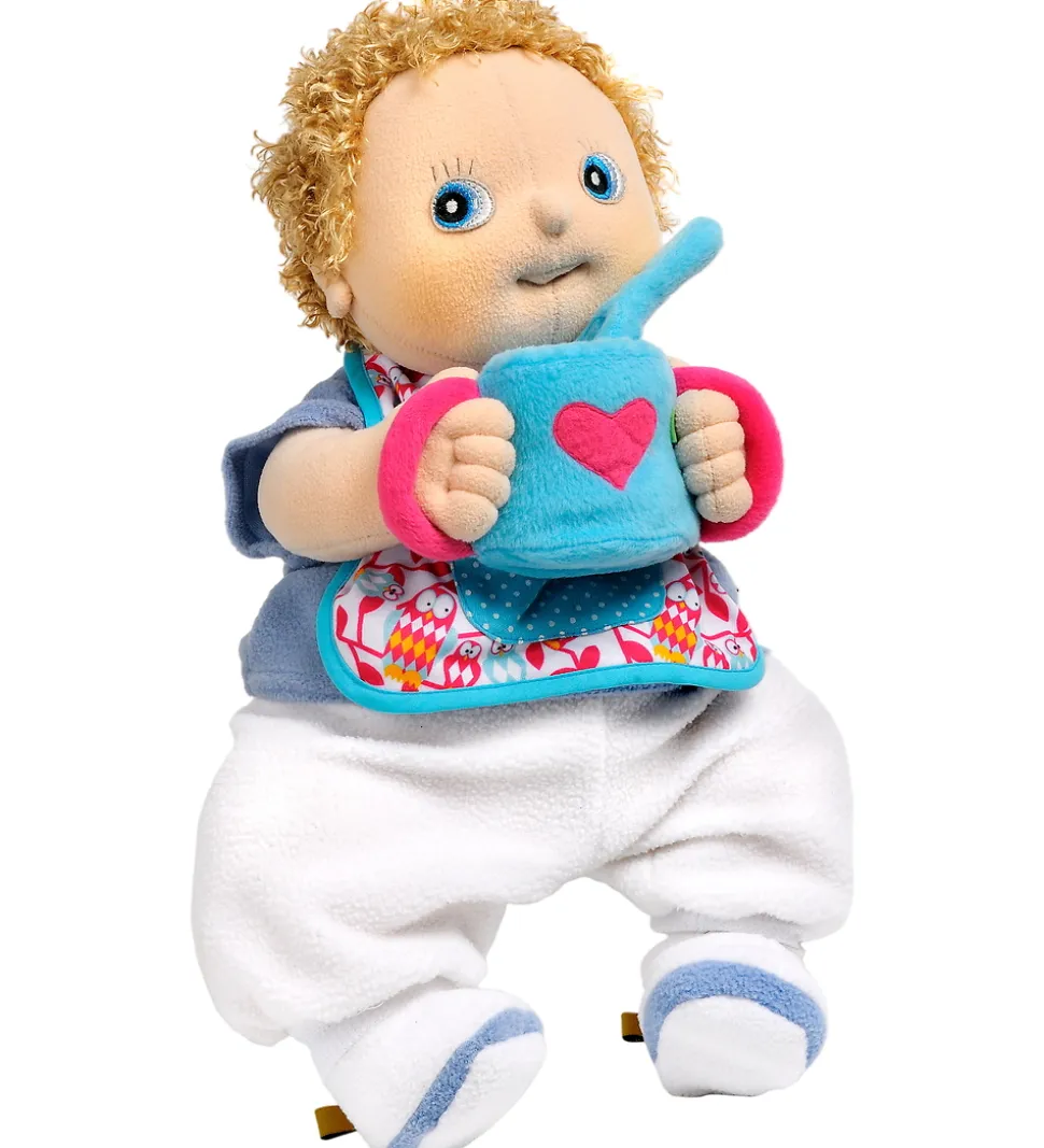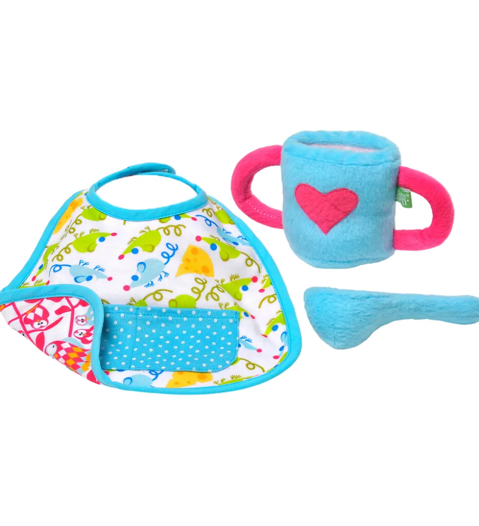 Farverigt Rubens barn madsæt bestående af en hagesmæk i blå med mønster i lyse nuancer, en kop i blåt plys med et pink hjerte samt en ske i blåt plys. Perfekt til detaljeret leg.