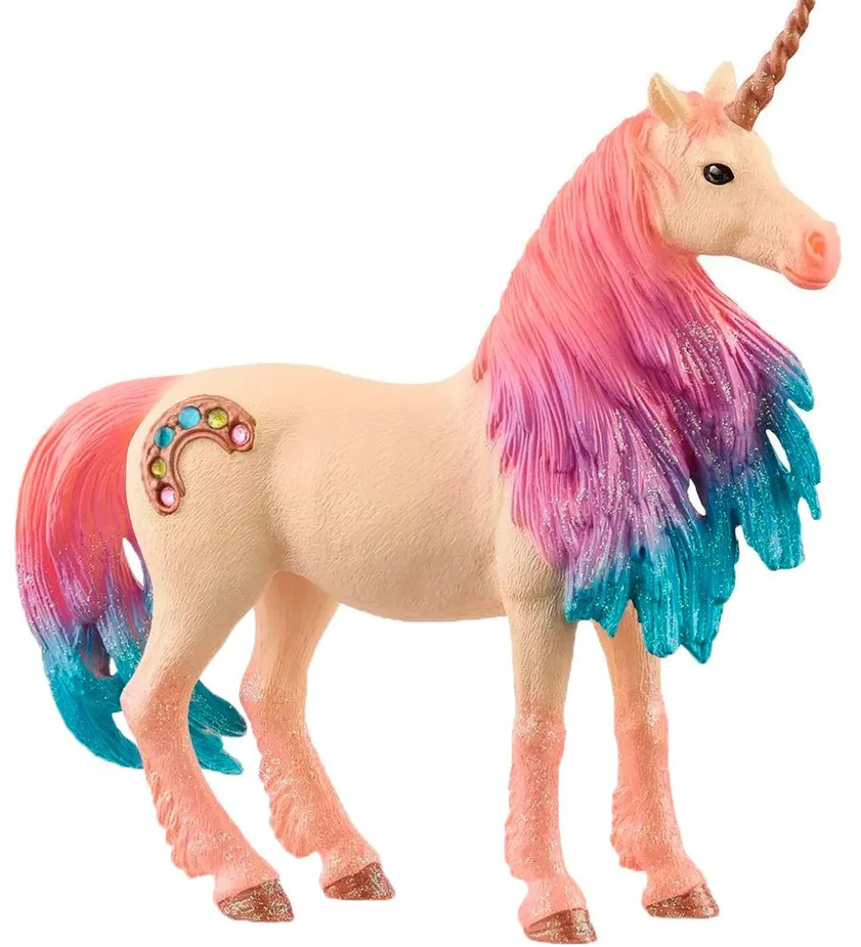 Flot Schleich Bayala enhjørning hoppe “Marshmello” i rosa, med detaljer i manken og halen i lilla og blå nuancer, med flot glimmer. På den ene side er der flotte similisten, i form af et hjerte.