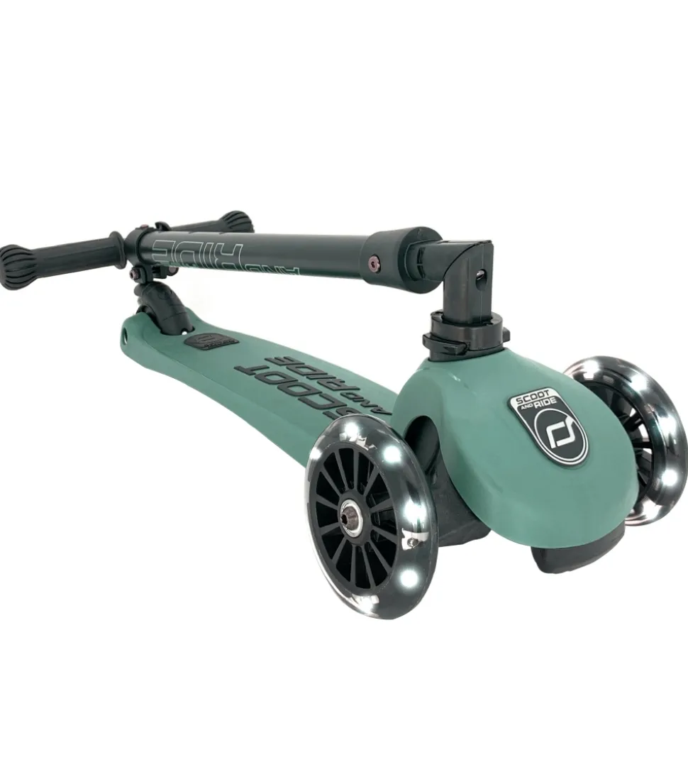 Scoot and Ride Highway Kick 3 er et smart løbehjul med to store hjul foran og et lille hjul bagpå med gode bremser. Løbehjulet har en bred plade til at stå på og er dermed meget stabilt. Styret er justerbart, så løbehjulet kan bruges i mange år. Hjulene har flotte LED lys, der giver en smart sikkerhedsdetalje. Løbehjulet kan foldes sammen uden brug af værktøj. Hjulene er i hård gummi.