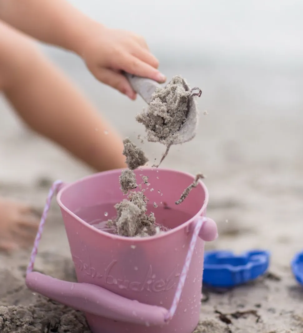 Scrunch spanden kan rumme 1,5 liter. Den er lavet af fleksibelt, blødt og foldbart silikone, så den er let at have med i strandtasken eller kufferten. Spanden har et praktisk, skridsikkert håndtag der passer perfekt ind i barnets hånd.