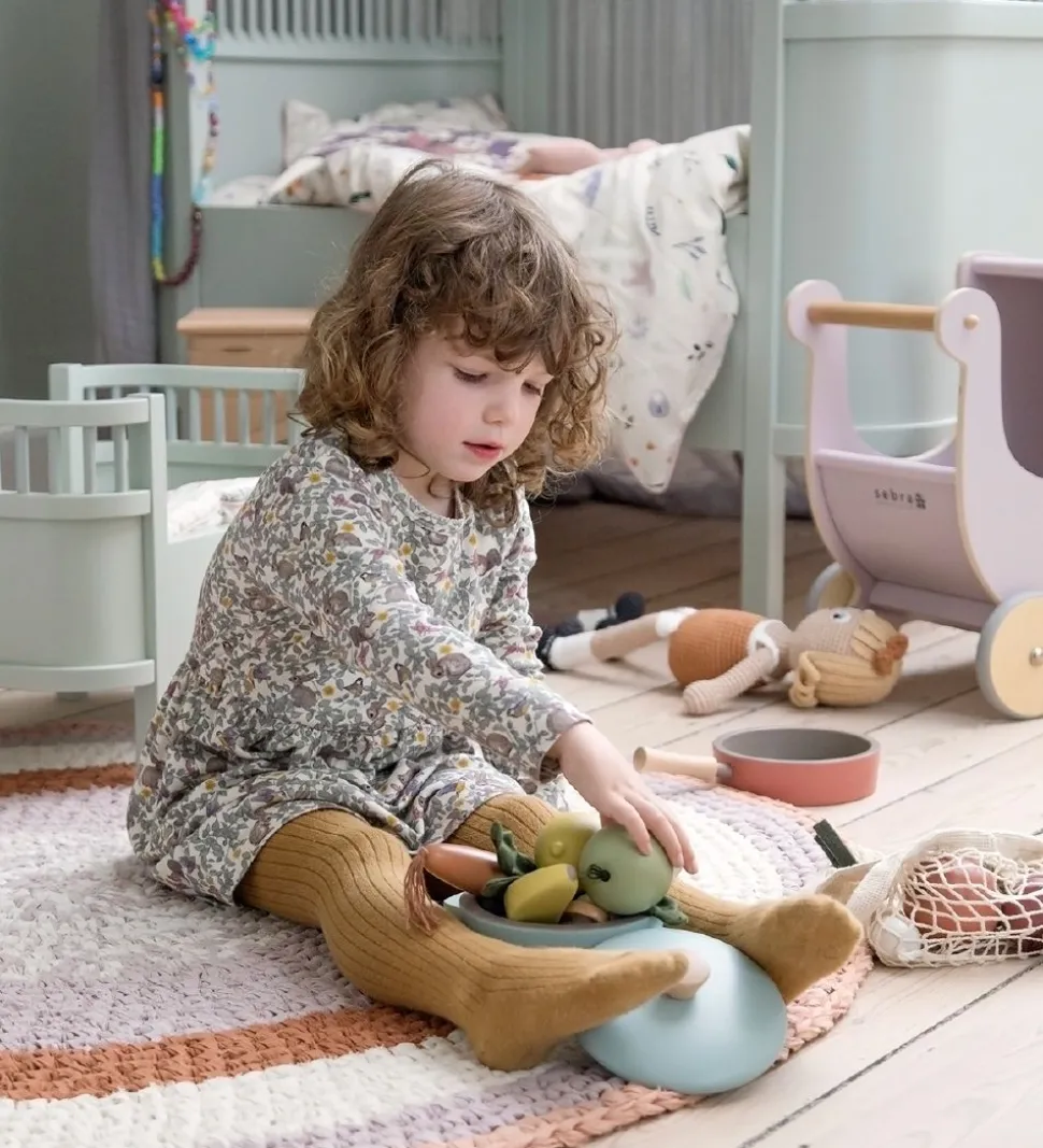 Sebra frugterne er lavet i træ med afrundede kanter, og de er behandlede med giftfri maling og lak. Flere af dem har fine detaljer i stof, som forestiller deres blade. Frugterne vil passe perfekt ind i et legekøkken eller til f.eks. at lege picnic, og grøntsagerne er nemme at transportere med det fine indkøbsnet.