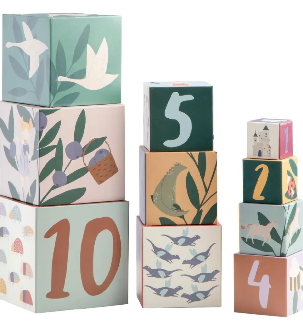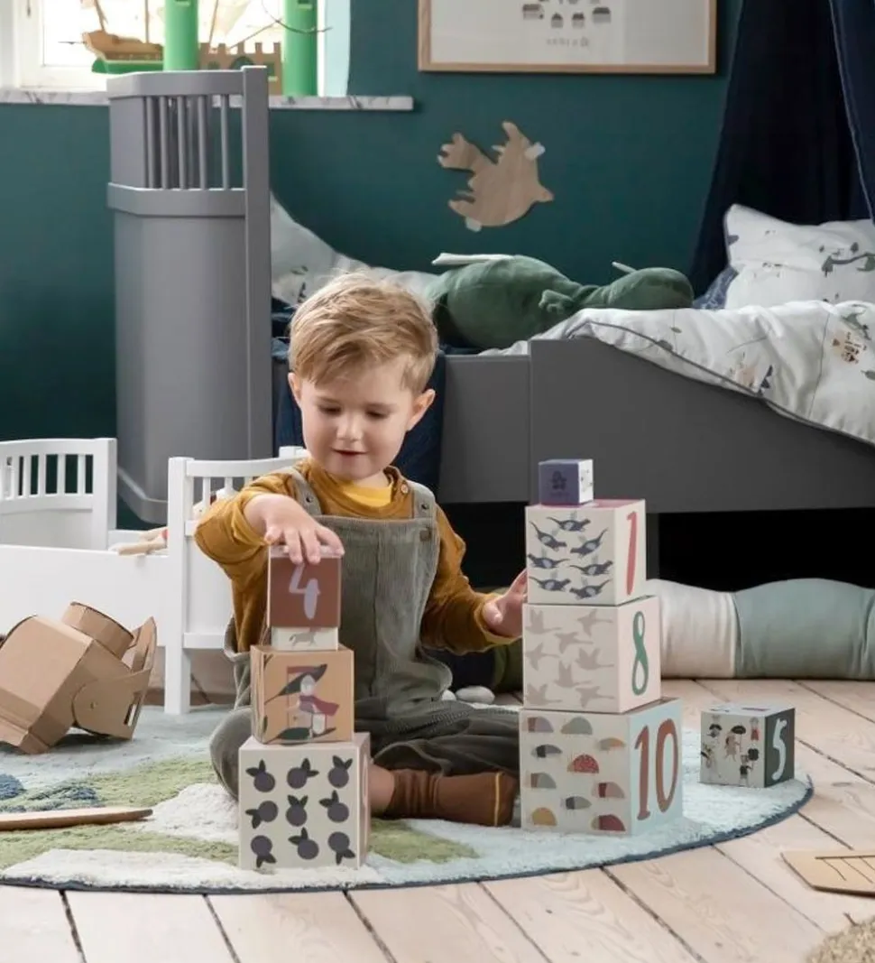 Klodserne kan stables og bruges som dekoration på børneværelset. Klodserne introducerer og lærer barnet om de forskellige tal og dyr, samtidig med at styrke finmotorikken.