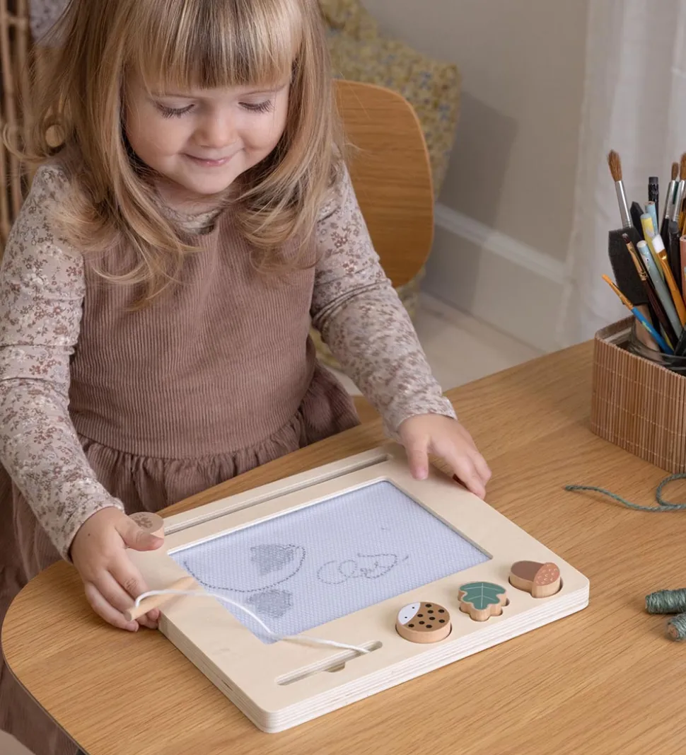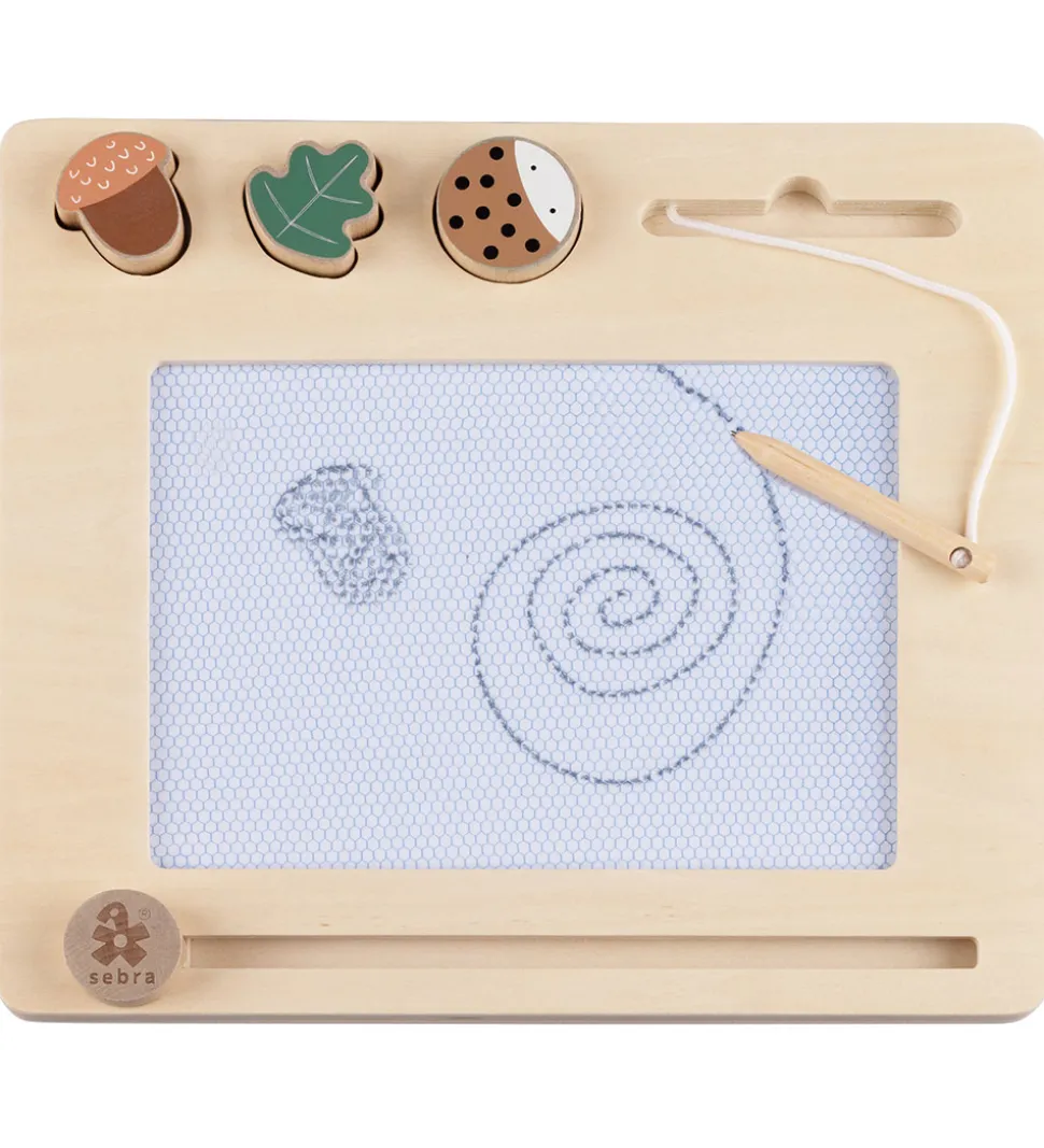 Sebra tegnetavlen kan bruges igen og igen. Med den medfølgende pen, kan man tegne lige, hvad man vil, og ved at skubbe en skyder i bunden hen over pladen, viskes tegningen ud, og man kan begynde på en ny. Der medfølger 3 stempler af træ med form et agern, et blad og en mariehøne.