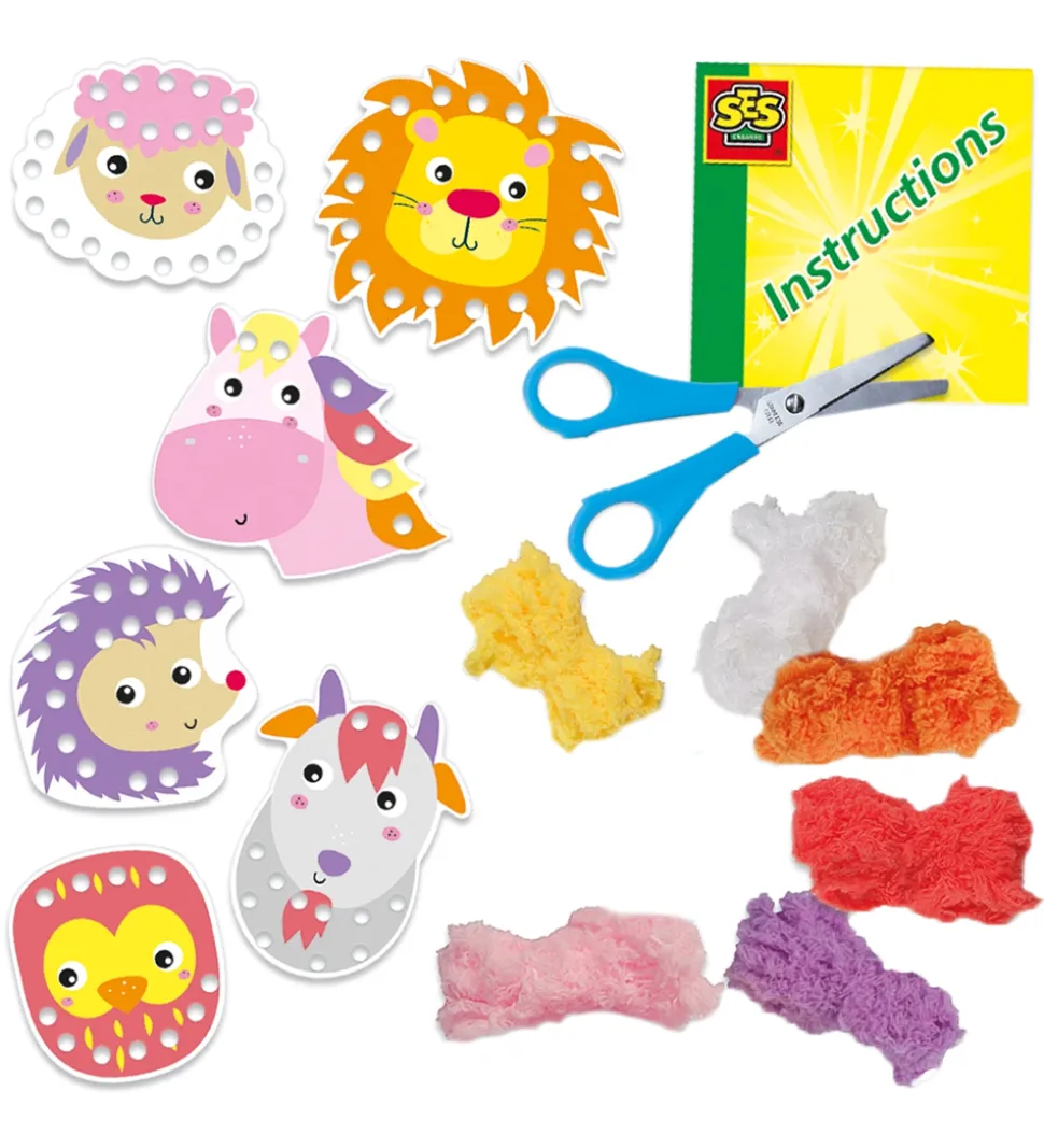 Sødt SES Creative broderi sæt bestående af plader med dyr, garn og en højrehåndet børnesaks.