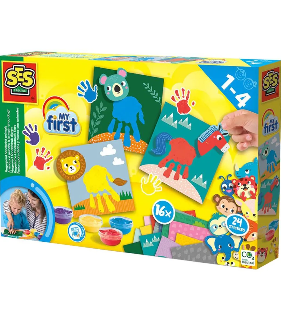 SES Creative fingermalingen er perfekt til de kreative små, da de skal sætte et håndaftryk på en af baggrundene og derefter sætte klistermærkerne på, så det endelige resultat ligner et sødt dyr.