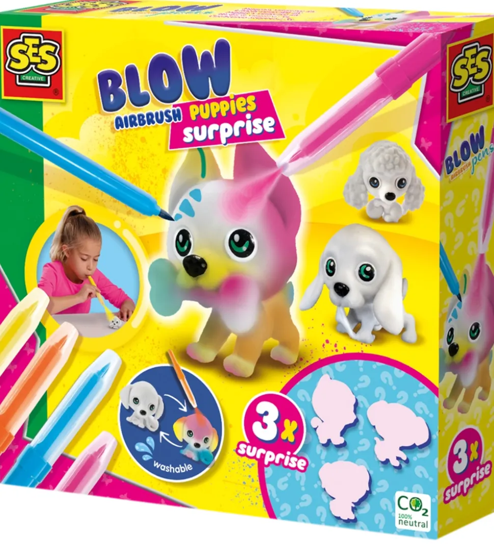 Fint SES Creative pustetussesæt der indeholder 3 hundehvalpe, samt 4 pustetusser i gul, orange, blå og pink.