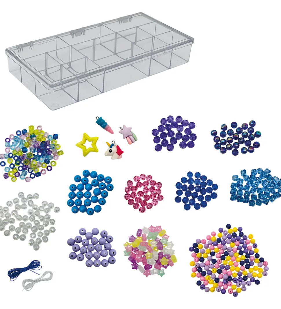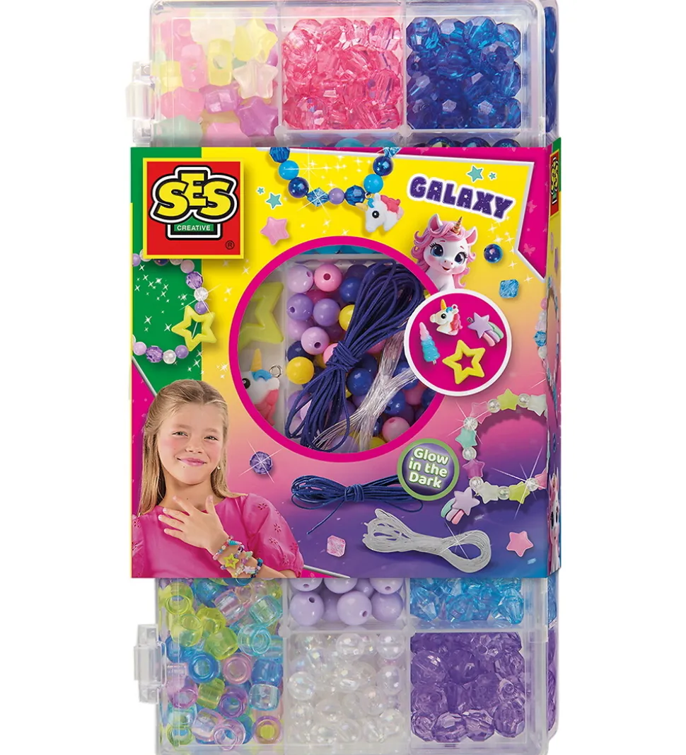 Fantastisk SES Creative kreasæt, som indeholder en række perler i flotte farver og snore der matcher. Perlerne har forskellige former, hvilket skaber flotte og varierede smykker og nogle af perlerne er selvlysende. Der medfølger 4 vedhæng som kan pynte på de flotte smykker.