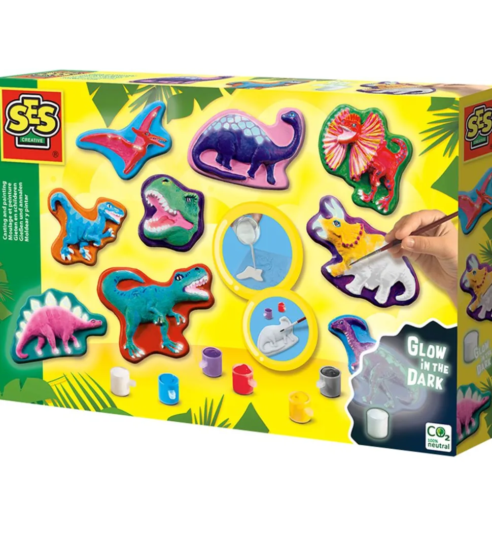 SES Creative støbe og malesættet er perfekt til de kreative små, som vil skabe deres egen leg. Med sættet kan man støbe forskellige dinosaurer, som derefter kan males i smukke farver. Der medføler en maling, som har en selvlysende effekt.