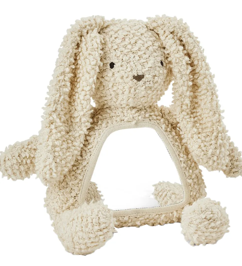 Sjovt Smallstuff aktivitetslegetøj i form af en kanin i hvidt bouclé med lange ører, ben og hale.