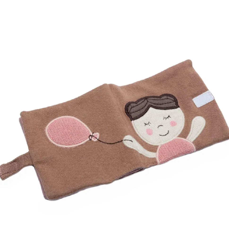 Sødt Smallstuff fotoalbum i en strikket kvalitet i brun med en dukke fortil.
