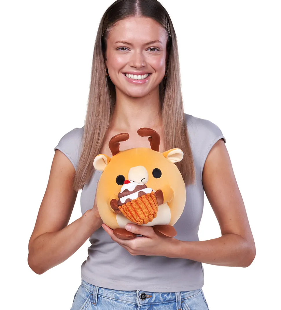 Fin Snackles bamse i form af elgen Jaime i brune nuancer. Bamsen er udformet som en rund pude med små ører, horn og et broderet ansigt, samt holder bamsen en chokolademousse.
