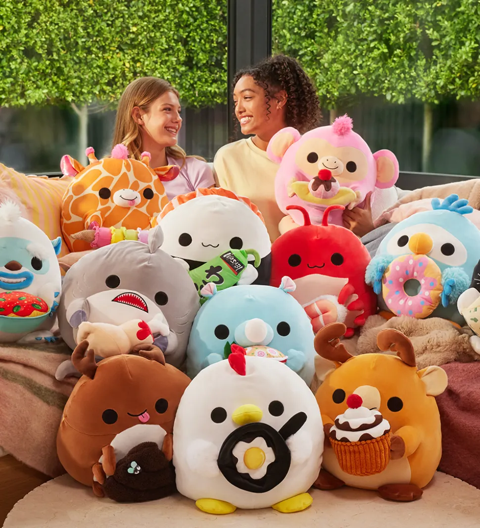 Fin Snackles bamse i form af elgen Jaime i orange og brun. Bamsen er udformet som en rund pude med ører, horn, fødder og et broderet ansigt, samt holder bamsen en chokolademousse.