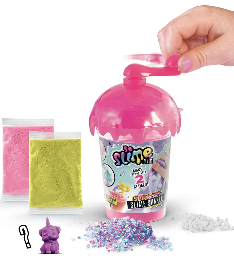 So Slime DYI-slimet er sjovt at lave selv og tilbyder mange timers leg. Bland slimet (slimpulver + vand) i slimbeholderen ved at dreje på håndtaget og tilføj overraskelsen.
