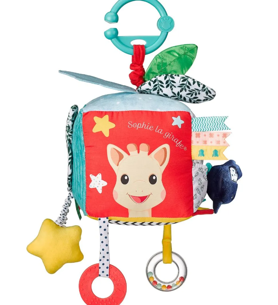 Sophie la Girafe aktivitetslegetøjet er lavet i en blød kvalitet, og på hver side af firkantet er der forskellige ting barnet kan lege med. Der er et spejl på den ene side. På to andre sider er der bideringe og blade som knitrer, når barnet rører ved dem. Når der trækkes i den ene snor spiller aktivitetslegetøjet musik og melodier.