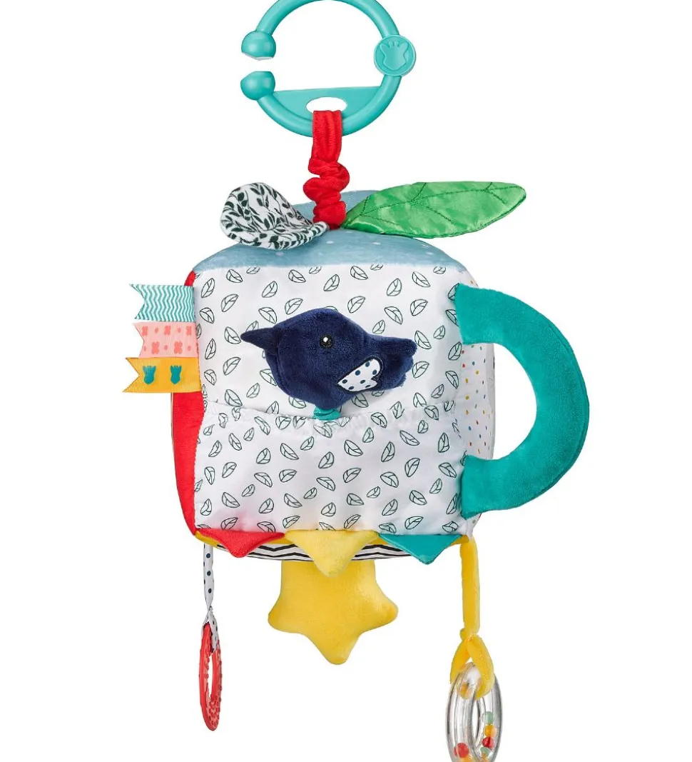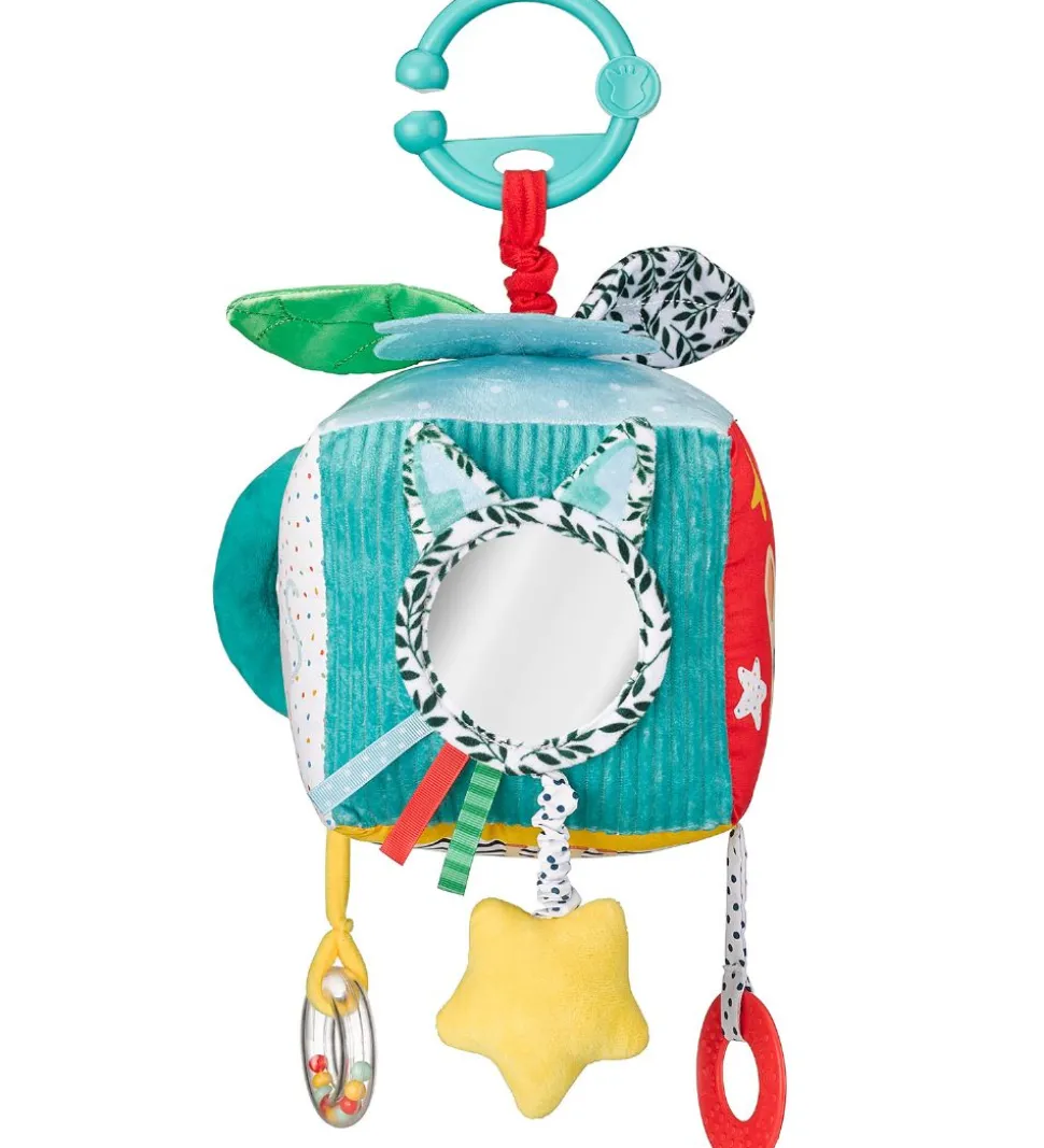 Sjovt Sophie la Girafe aktivitetslegetøj, der består en firkant i fine farver og med print af giraffen Sophie på og en grå kat.