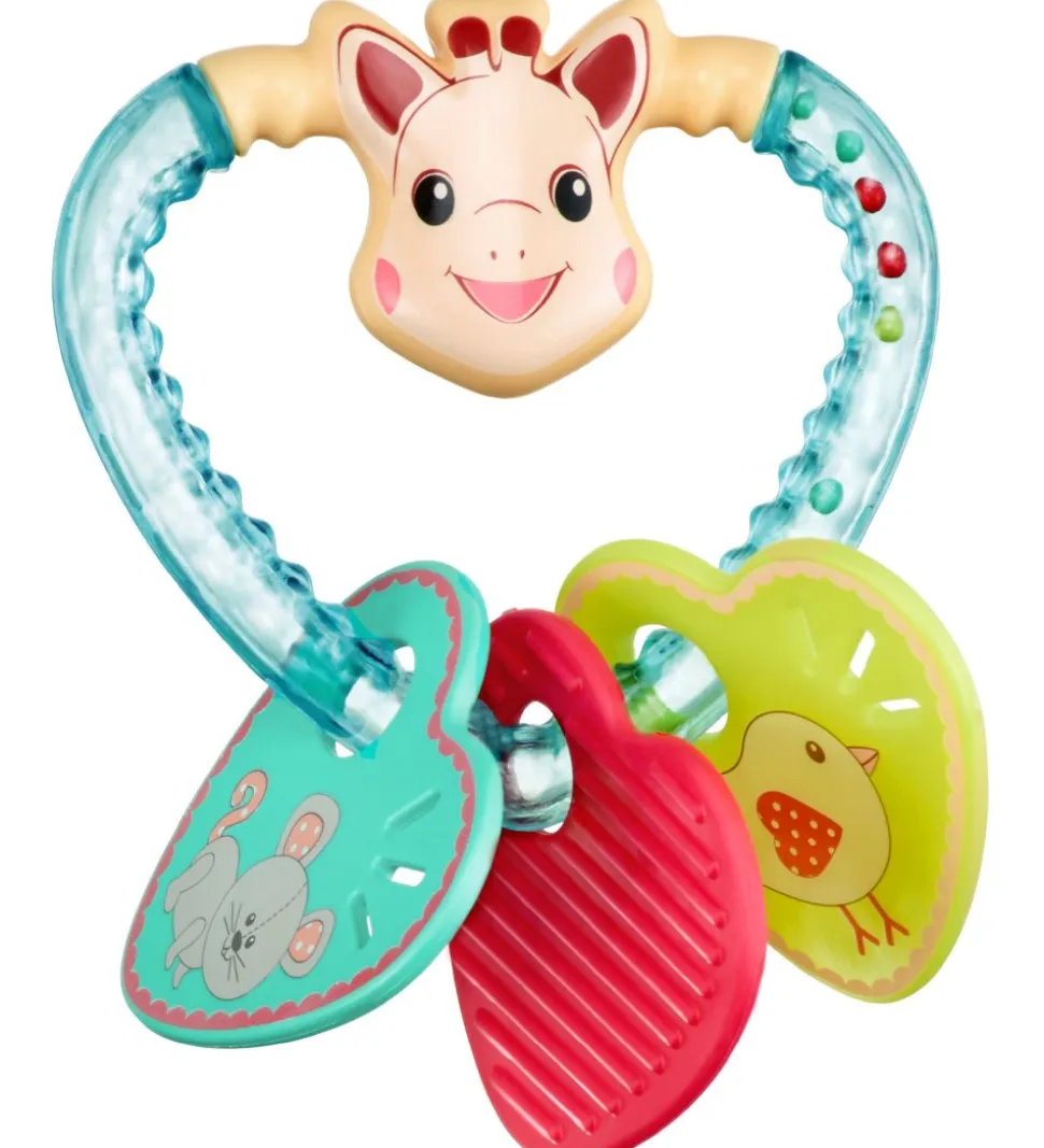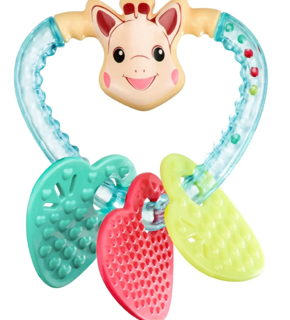 Sophie la Girafe ranglen består af en bidering med tekstur og farverige perler indvendigt. De tre hjerter kører rundt om ranglen og har forskellige teksturer, så de laver lyde når de rammer hinanden. Bideringen er med til at stimulere barnets tænder, når de klør.
