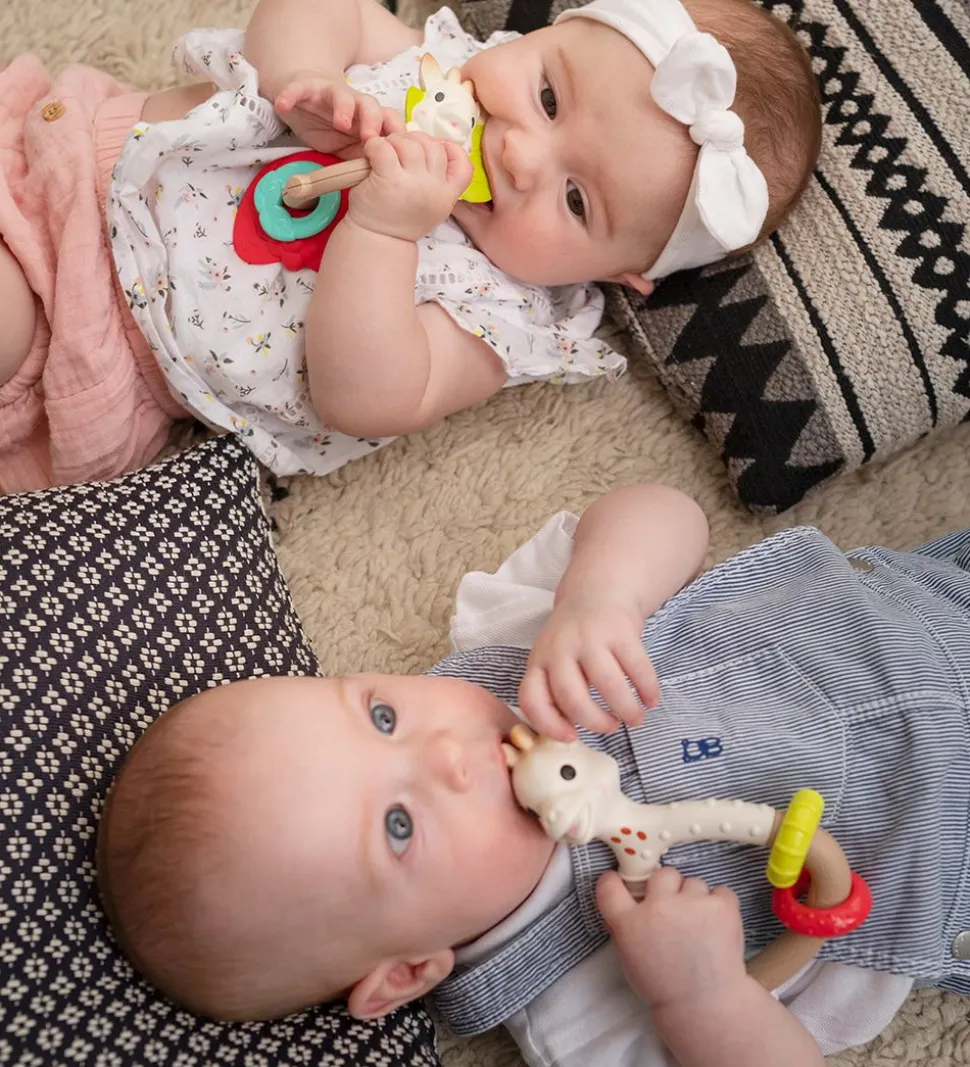 Sød Sophie la Girafe rangle med tre små bideringe siddende på, hvoraf den ene er giraffen Sophies hoved i cremehvid og brune prikker.