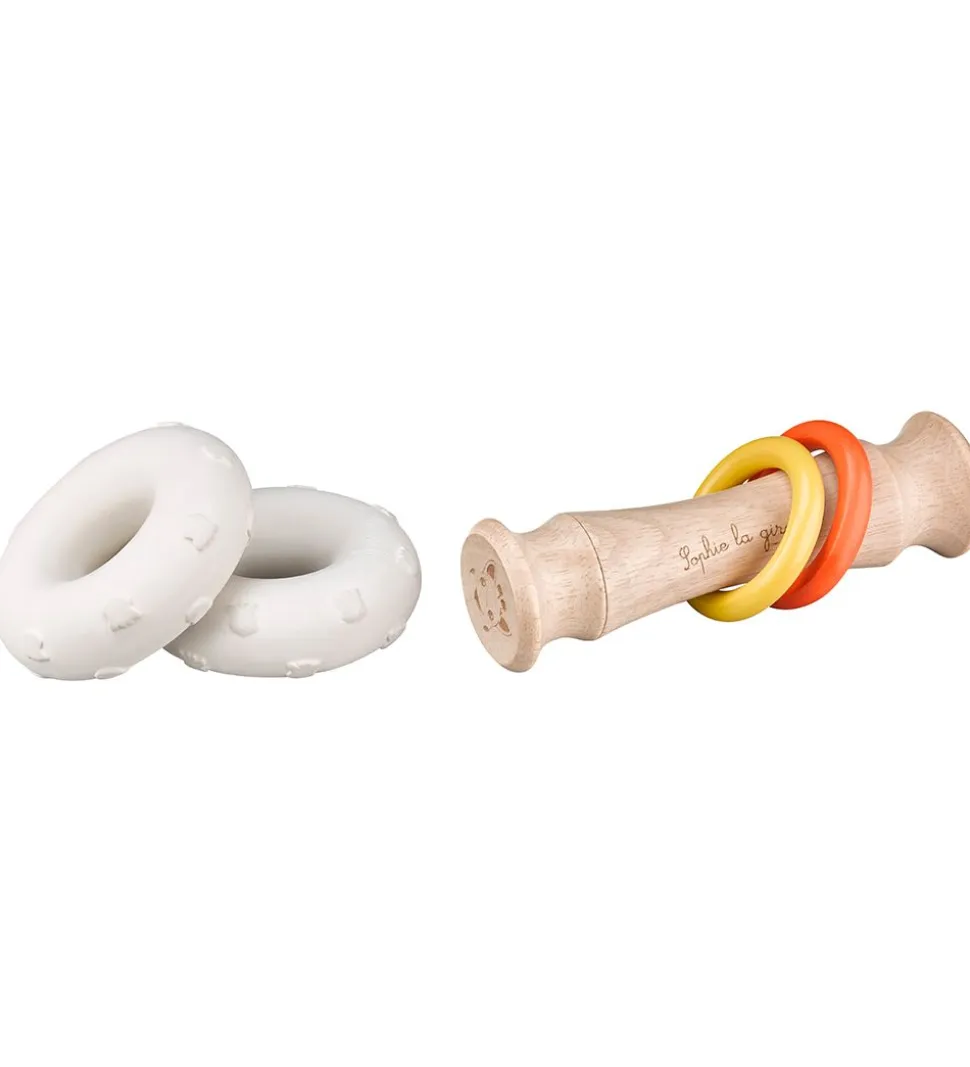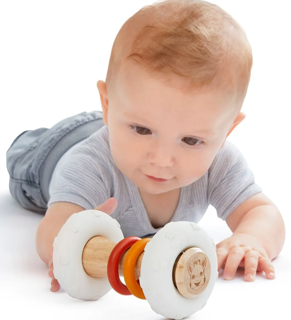 Sophie la Girafe rangle er nemt at tage fat i ved træhåndtagtet, hvor der også er to ringe, som bidrager med en rasleeffekt. Ranglen kan også trilles på de store gummiringe i enderne.