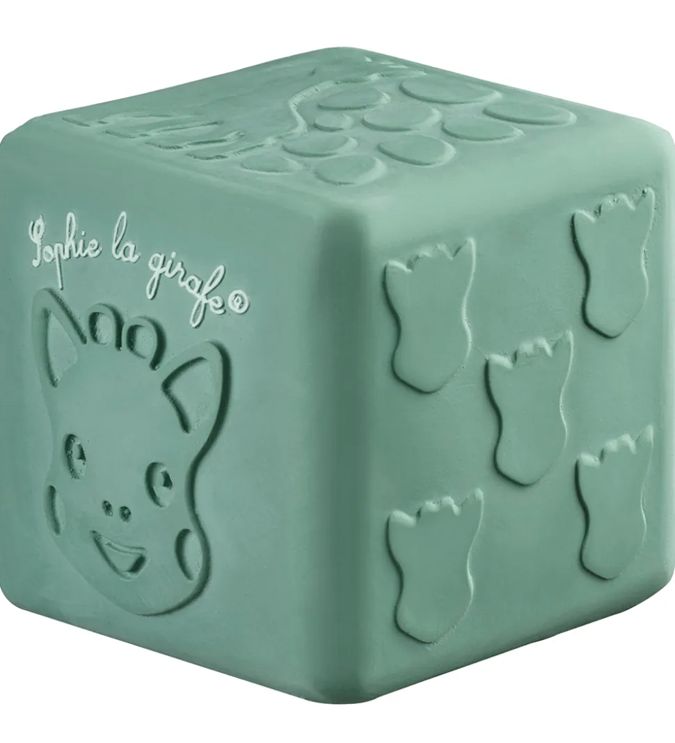 Skønt Sophie la Girafe sanselegetøj i form af en terning i en støvet grøn nuance.