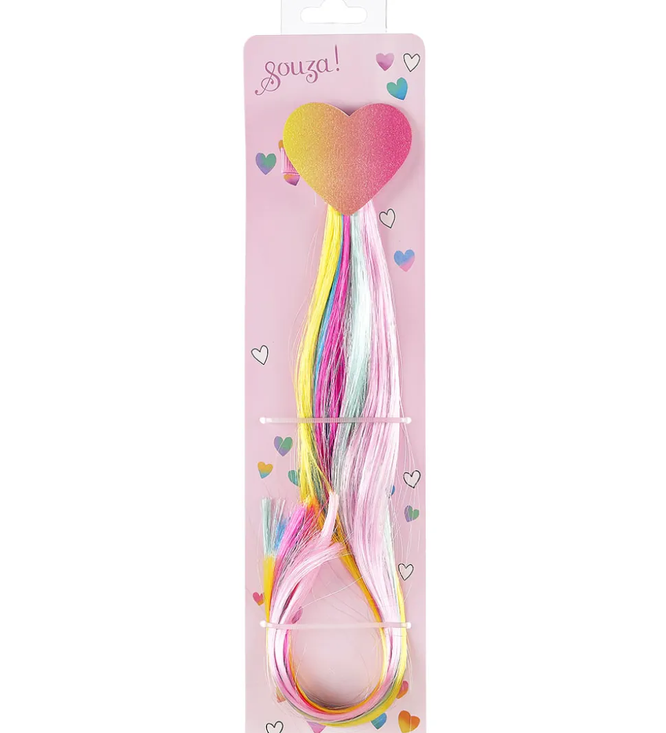 Souza hårklemmen er lavet som et glimmer-hjerte i gul og rosa og har multifarvet hår. Hårklemmen passer perfekt til udklædning.