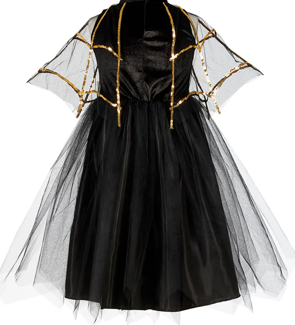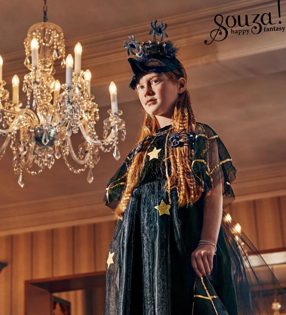 Souza udklædningen er sort med tyl ud over skørtet og skuldrene og dekoreret med stjerner og spindelvæv i guldglimmer.