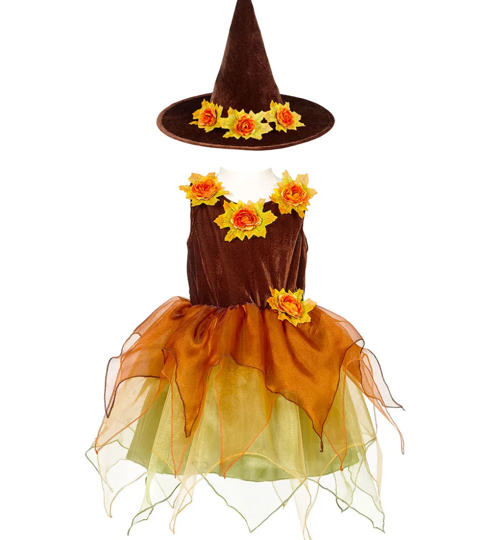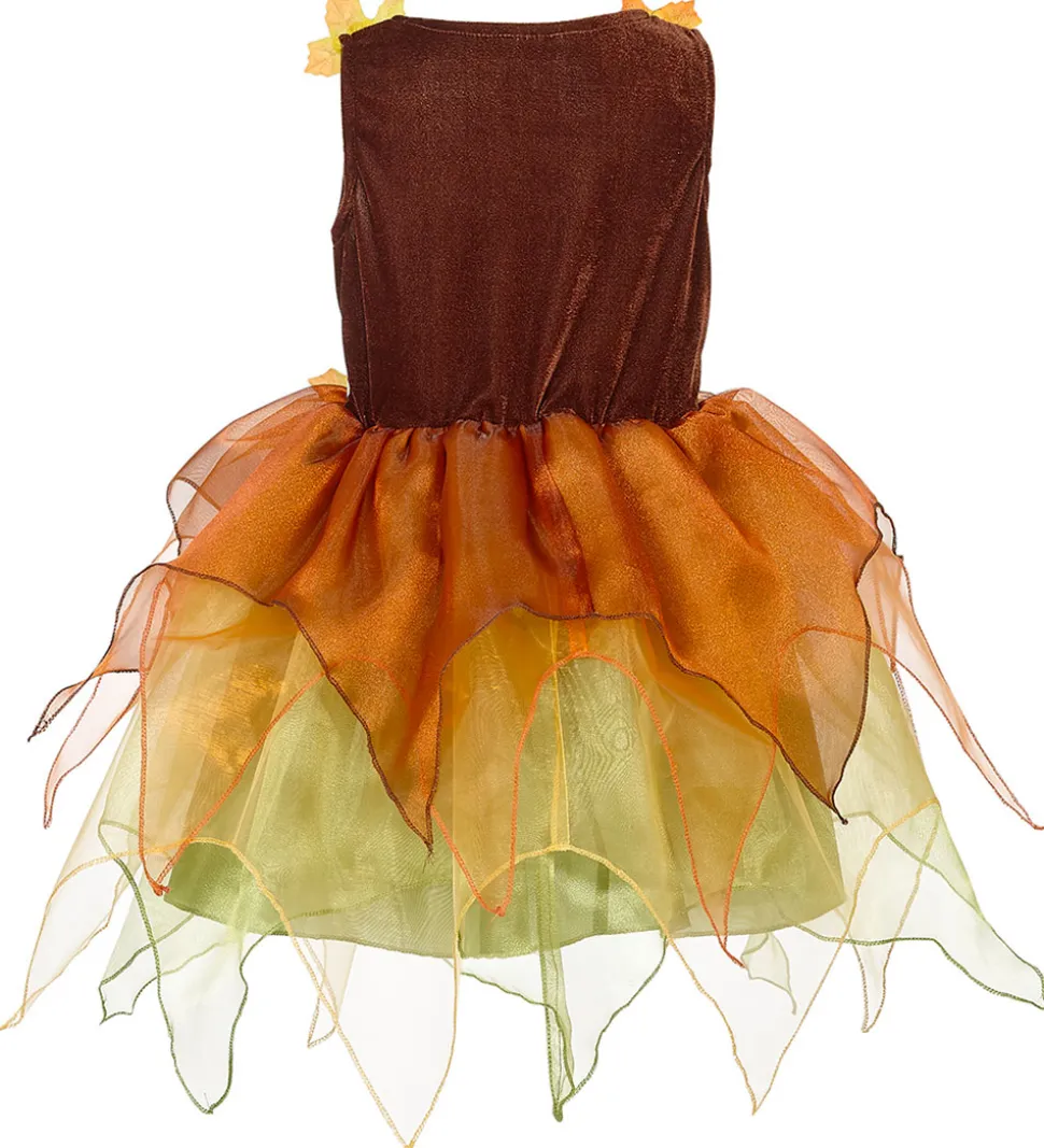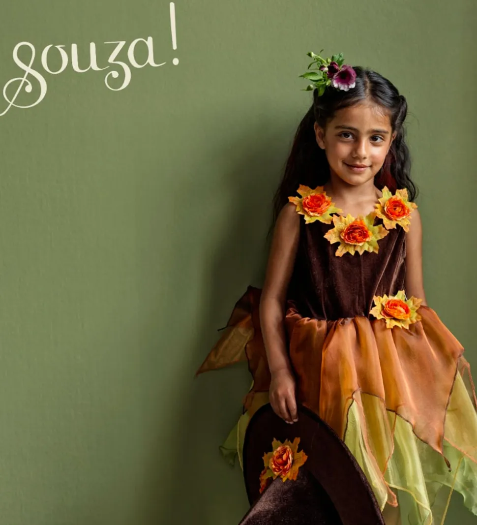 Souza udklædningen er i smukke efterårsnuancer af brun, orange og grøn og er dekoreret med tyl og store, flotte blomster.