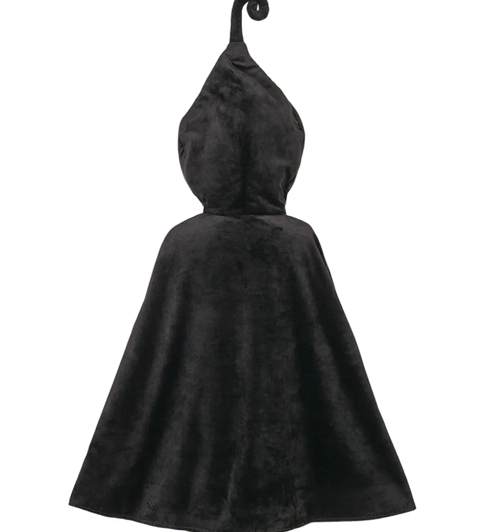 Souza udklædningen er i sort med orange græskar på ydersiden og orange på indersiden. Kappen har hætte med en spire på toppen og lukkes under hagen med velcro.