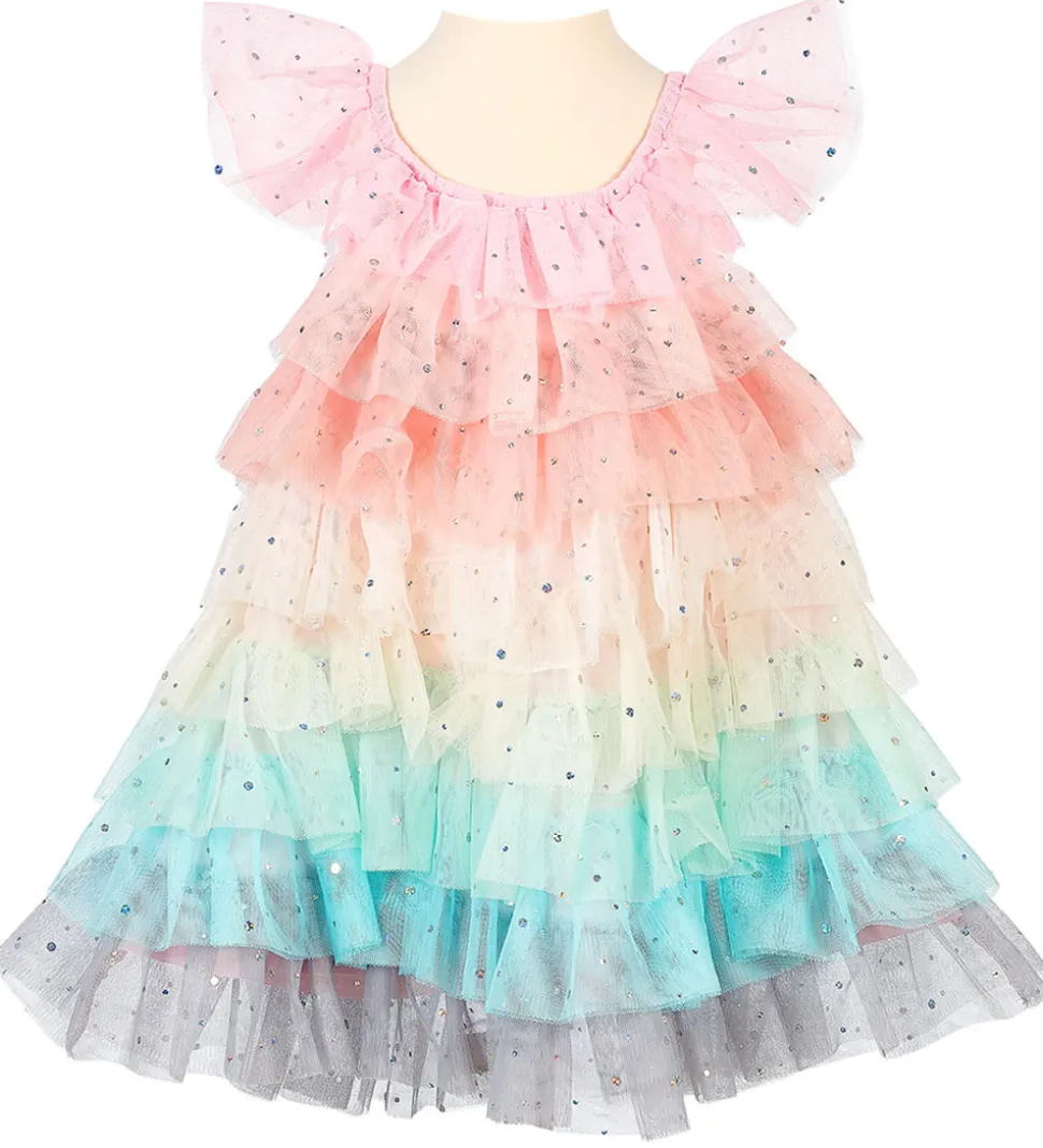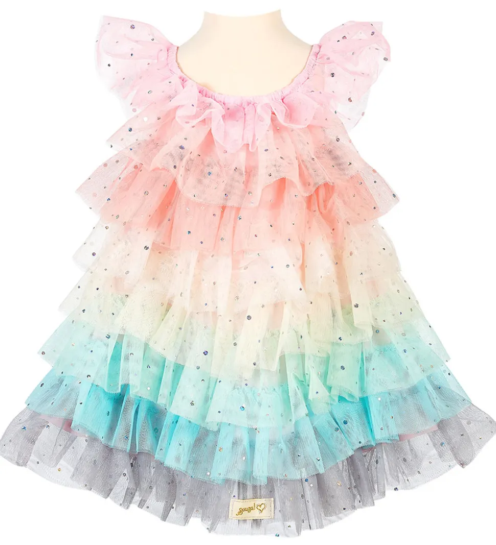 Souza udklædningen er i flerlags tyl med regnbuefarver i pastelnuancer og med sølvglimmer over det hele.