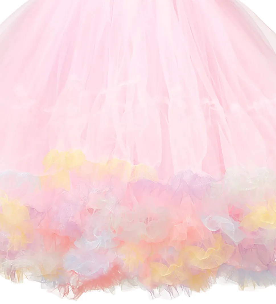 Souza udklædningen er rosa med tyl, pailletter og multifarvede detaljer såsom en blomst ved hoften.