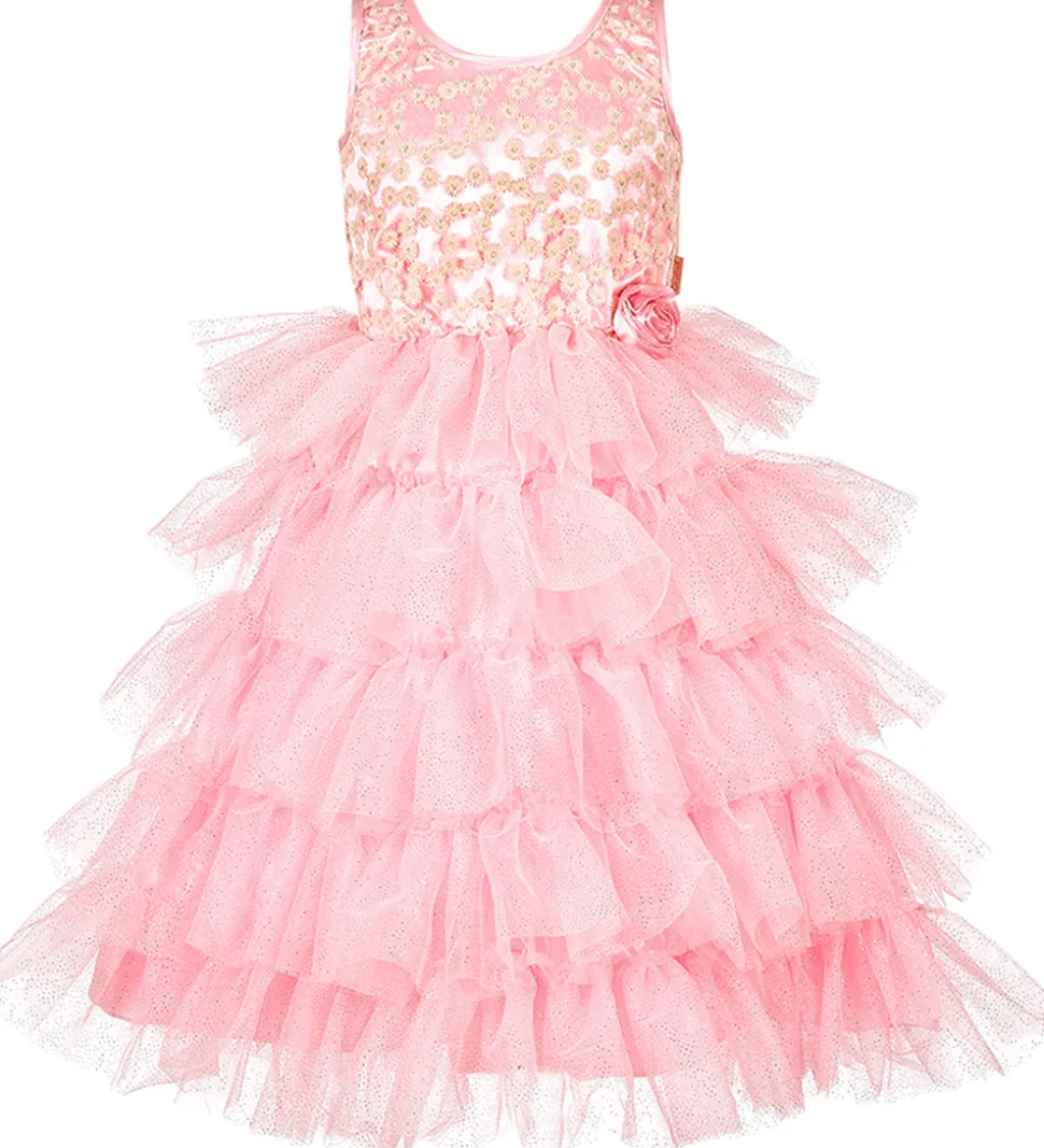 Souza udklædningen er i en flot, rosa farve og dekoreret med hvide blomster og små guldprikker. Prinsessekjolen har en rund udskæring, ingen ærmer, elastikkant om taljen og et stort skørt med tyl og mange lag.