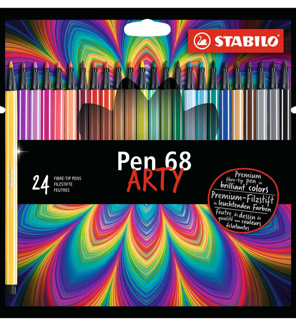 Fine Stabilo tuscher solgt som et sæt 24 stk. i forskellige farver.