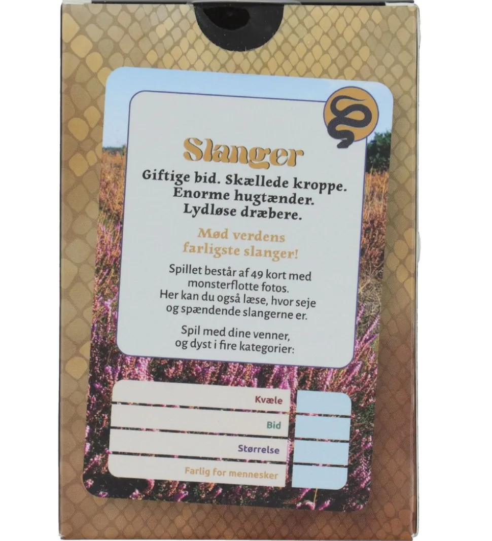 Straarup & Co kortspillet “Farlige Slanger” relaterer sig til Maxi-bogen “Farlige Slanger” – men kan sagtens spilles uden bogen. Kortspillet består af 49 kort med monsterflotte fotos af alverdens farlige slanger. På hvert kort kan du læse mere om hver enkelt art, der har fået karakterer i fire forskellige kategorier – ‘Kvæle’, ‘Bid’, ‘Størrelse’ og ‘Farlig for mennesker’. Spillet passer i sin grundform perfekt til børn i indskolingen, mens elever på mellemtrinnet kan gøre brug af ekstrakort for at gøre spillet sværere og sjovere.